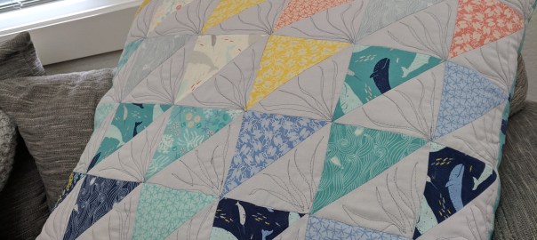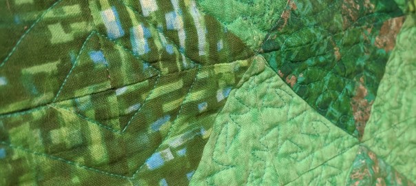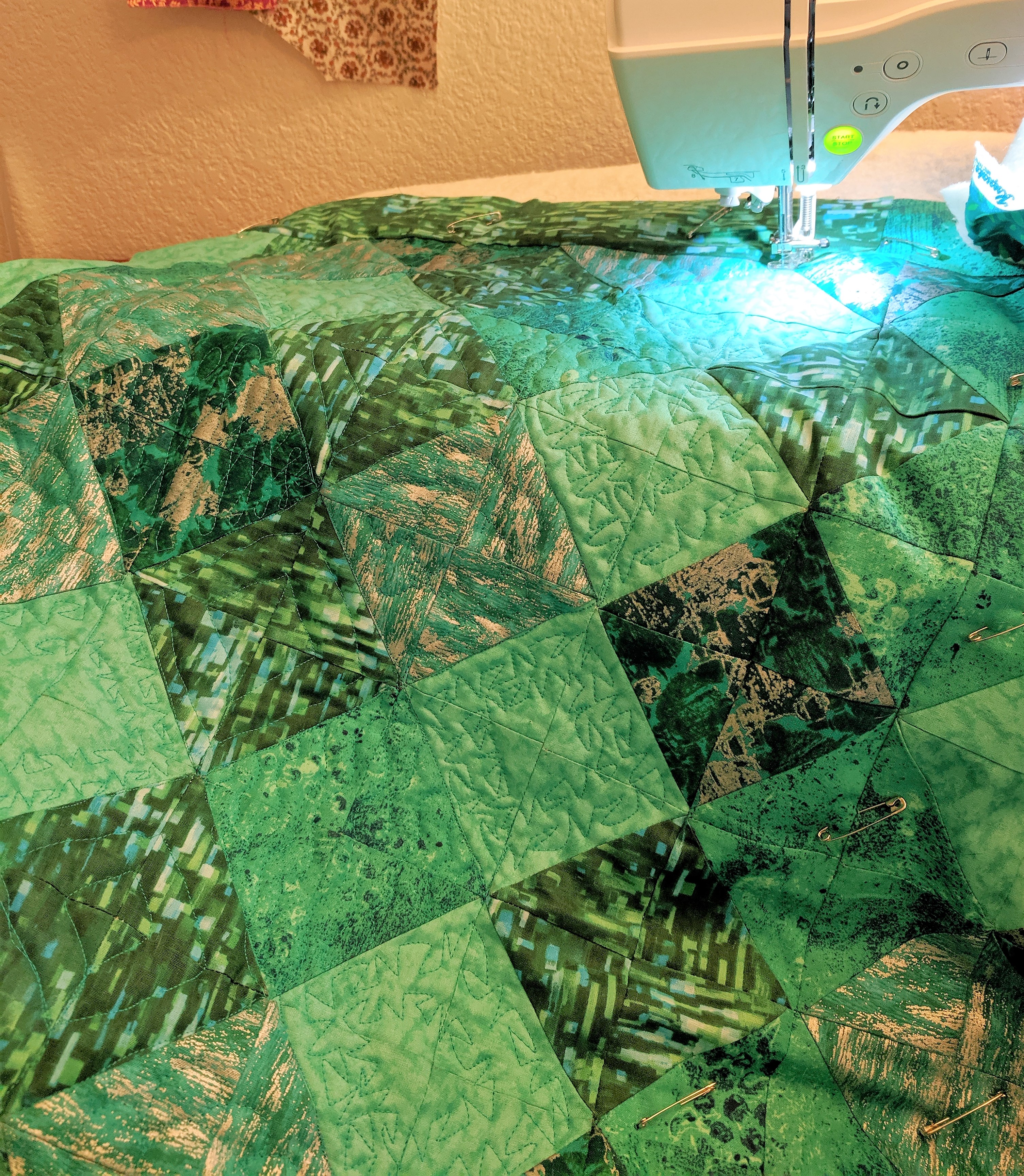So anyway after pinning the living daylights out of my sandwich, I sat down to do some free motion. You always start in the middle and work your way out, just like basting. I decided to work down the rows so that I could keep doing the same design and keep it in my muscle memory. One of my issues with this quilt was moving from diamond to diamond – some of my designs didn’t bring me back to my starting point, or guide me into the next diamond. Also, since this was an HST design, there can be up to 8 layers of fabric at the intersections, which made it bumpy and hard to quilt near the centers and points of each diamond.