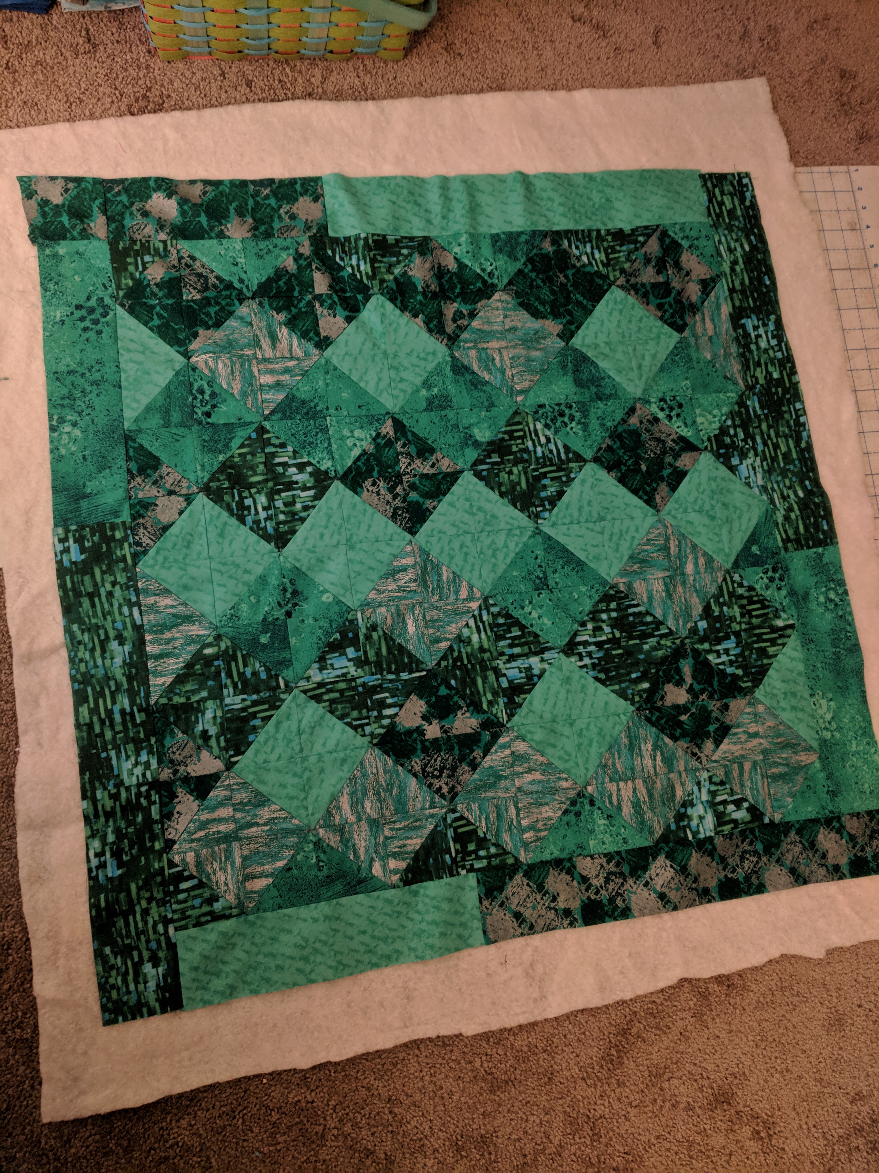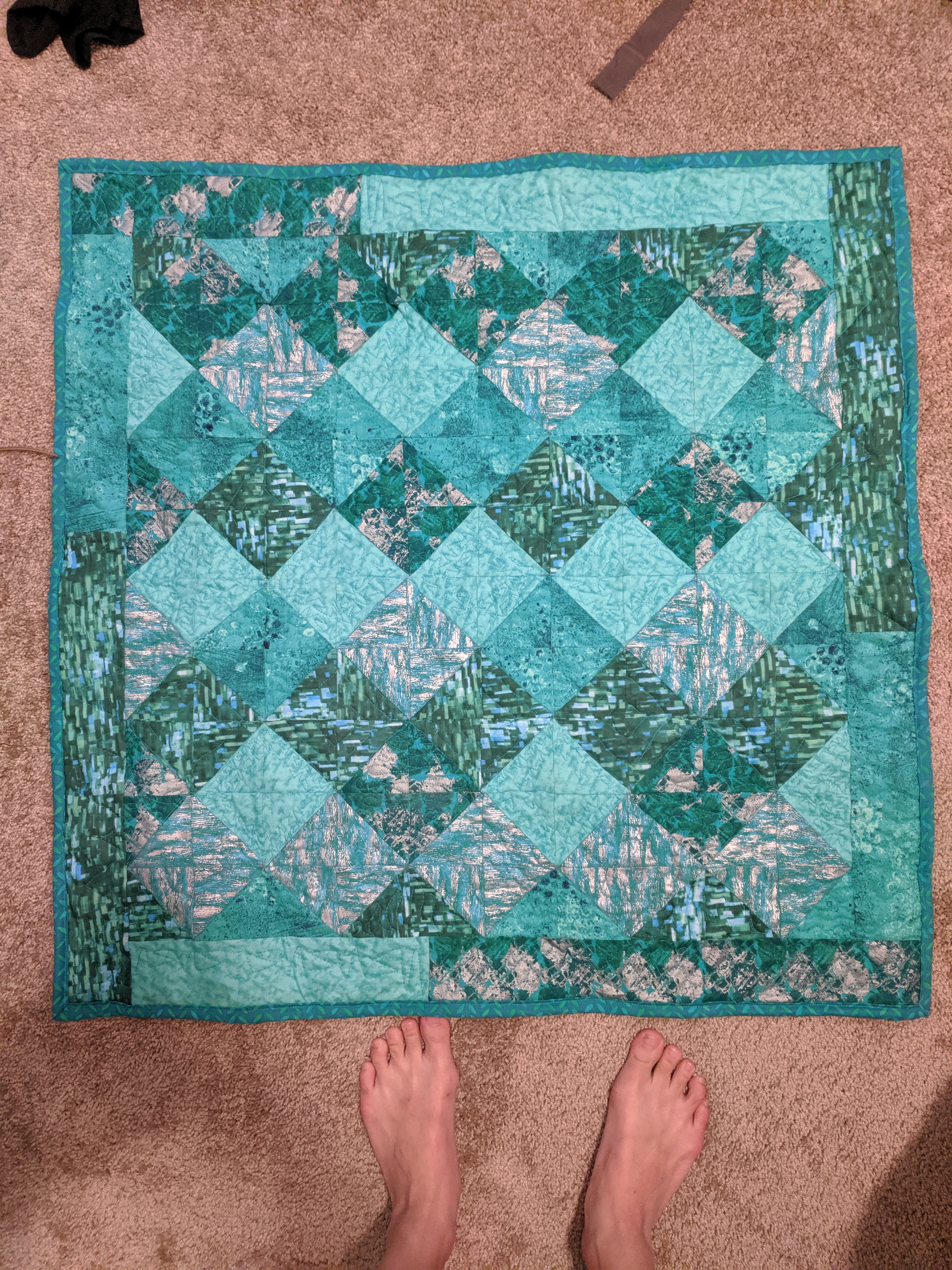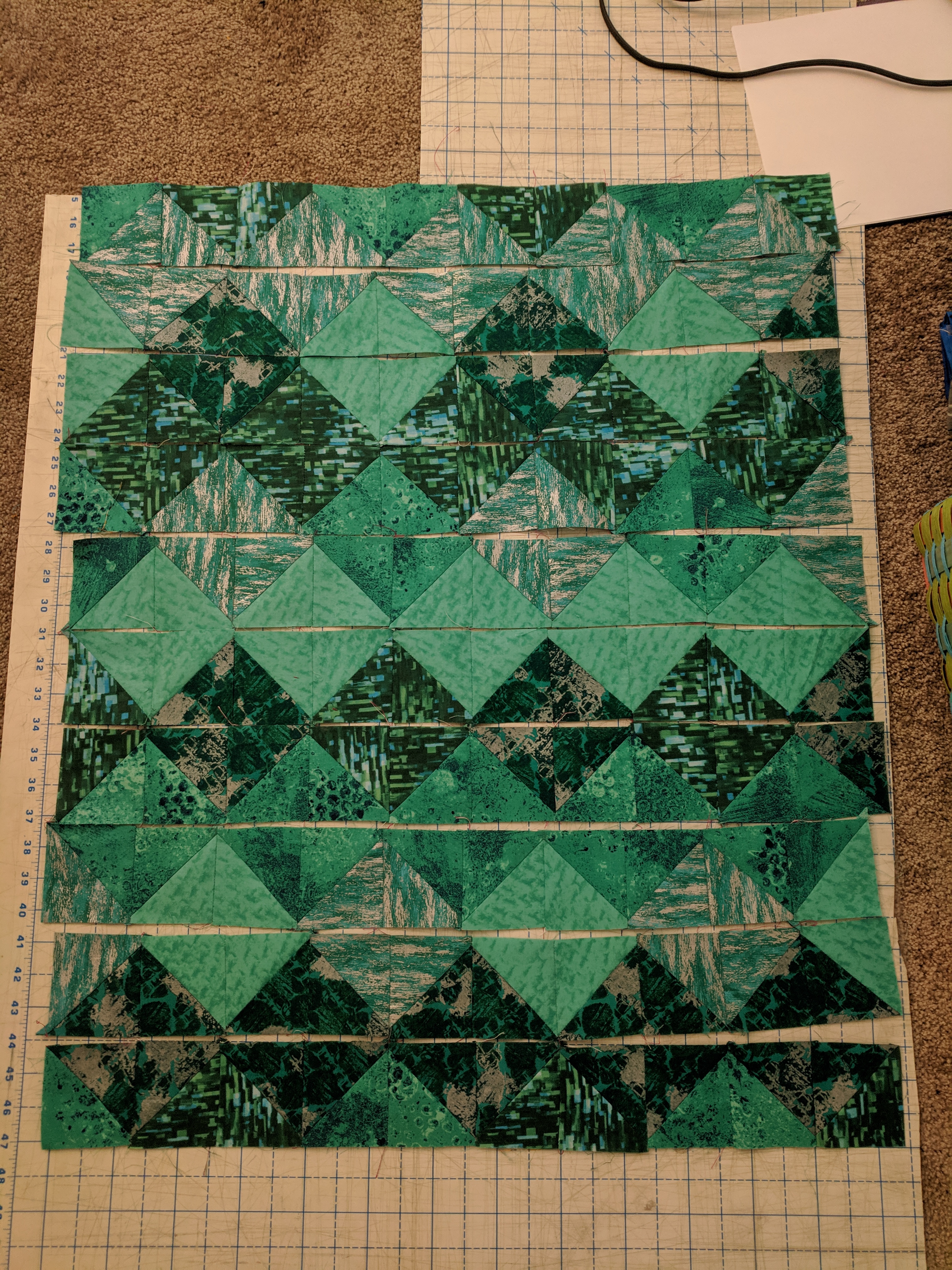 So the Green Diamonds was meant to be a trial “mess up” quilt before I attempted to quilt the rainbow bargello (see next week). I got a cheap 5-fabric fat quarter (18″x21″ piece) bundle from Joann, and cut each fabric into squares. I made half square triangles (HSTs) of each pair of fabrics – so each fabric had a set of HSTs with each other fabric. I decided to lay them out in a fake “on point” design, so that each fabric was represented by a row of diamonds. This created a secondary block, or pattern, between the rows of diamonds that’s diamonds of alternating fabric. I sewed these together in rows, then sewed the rows together. I used some excess fabric for the border.