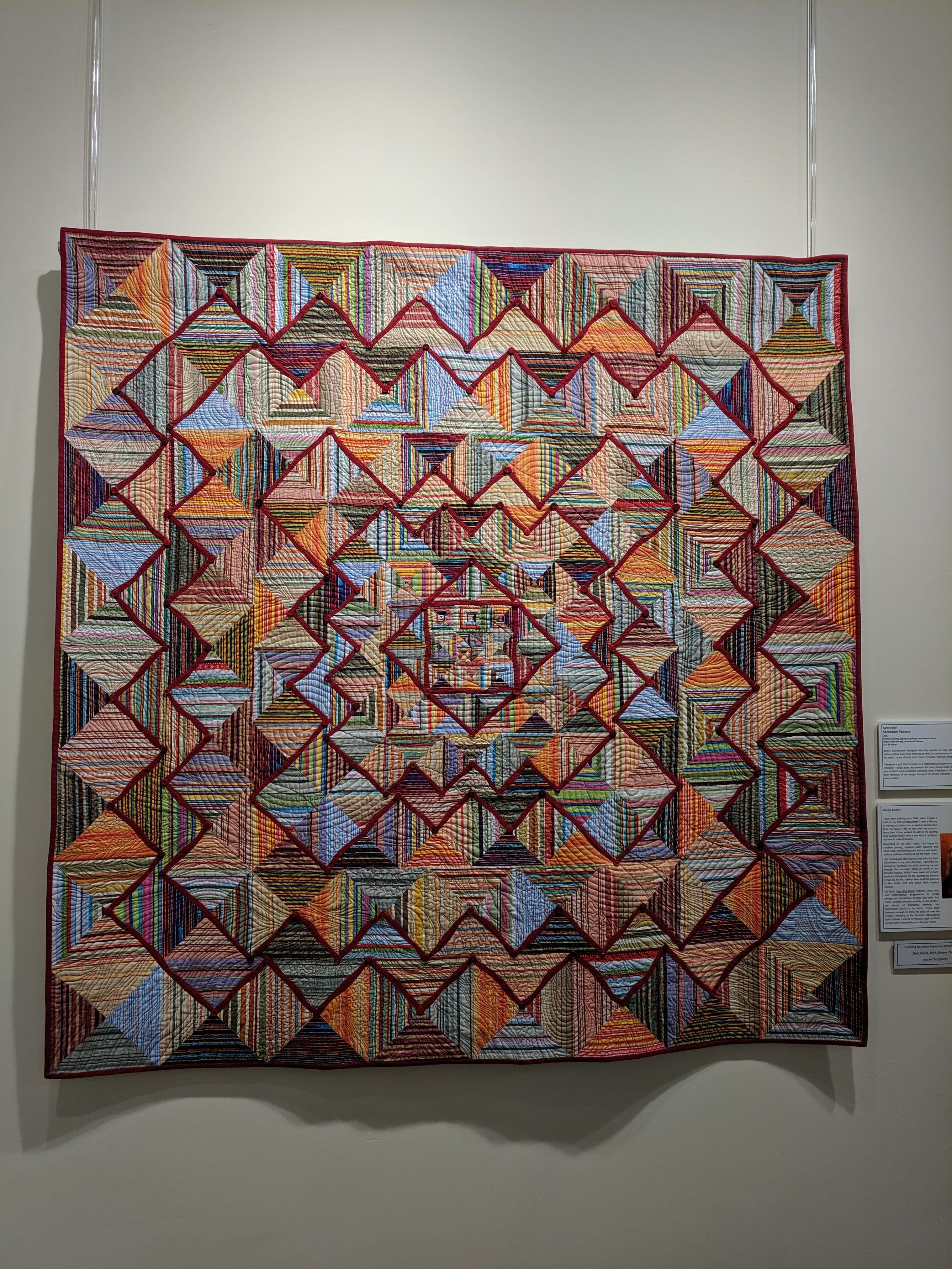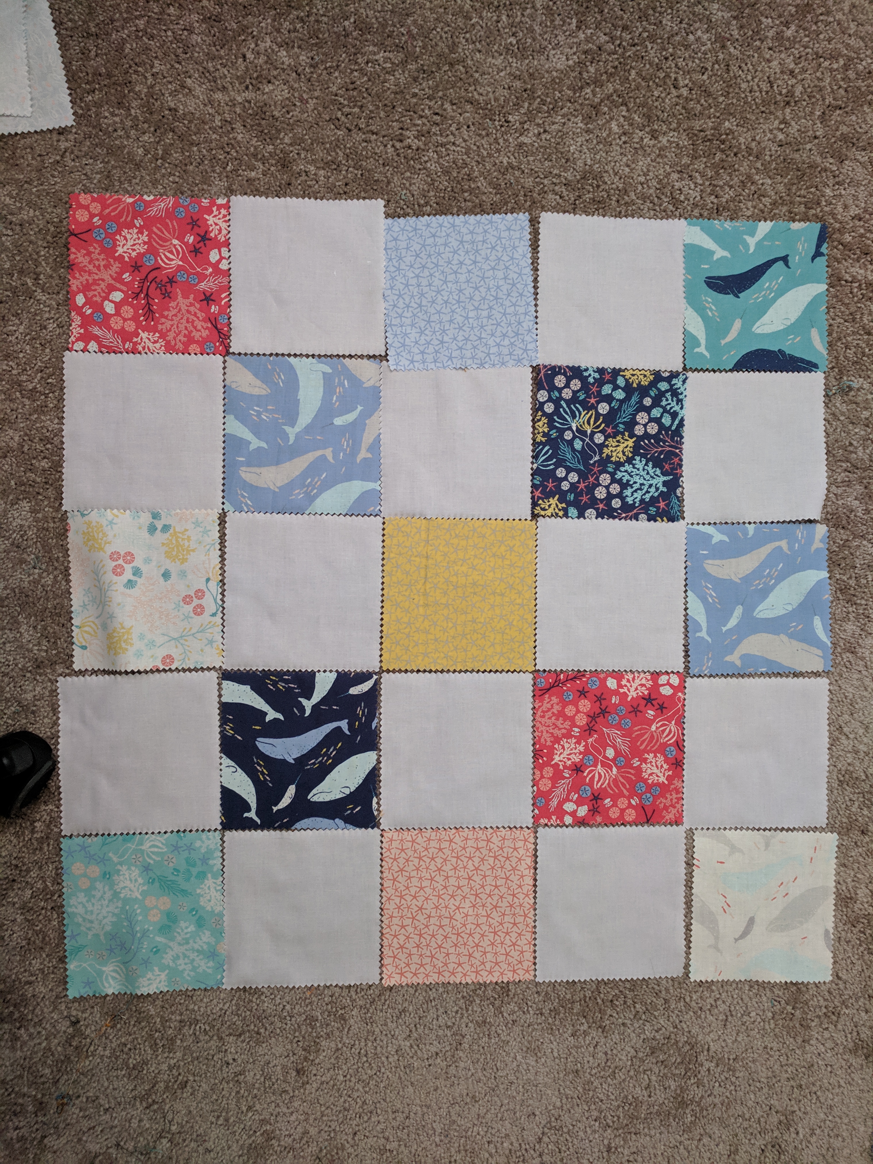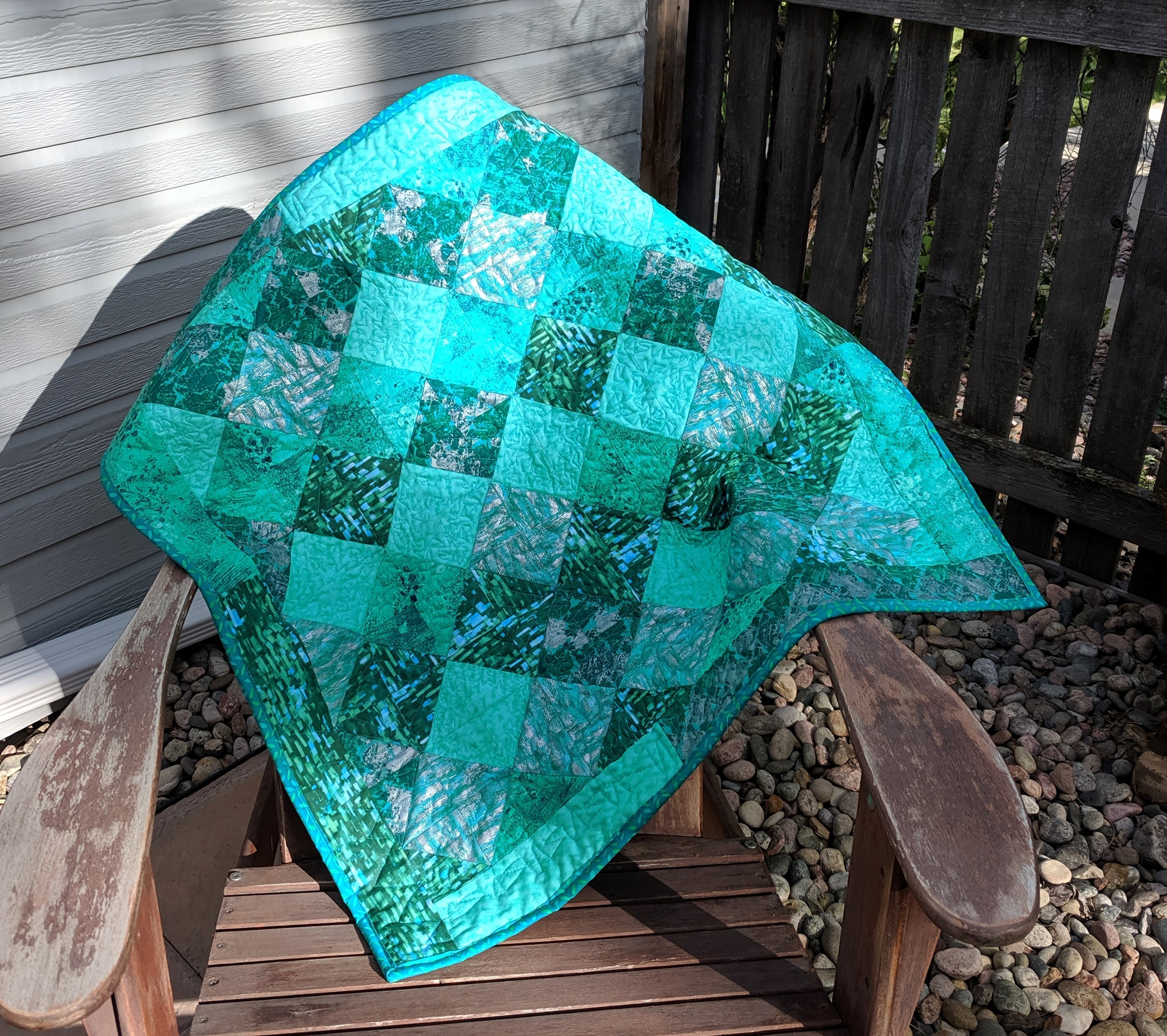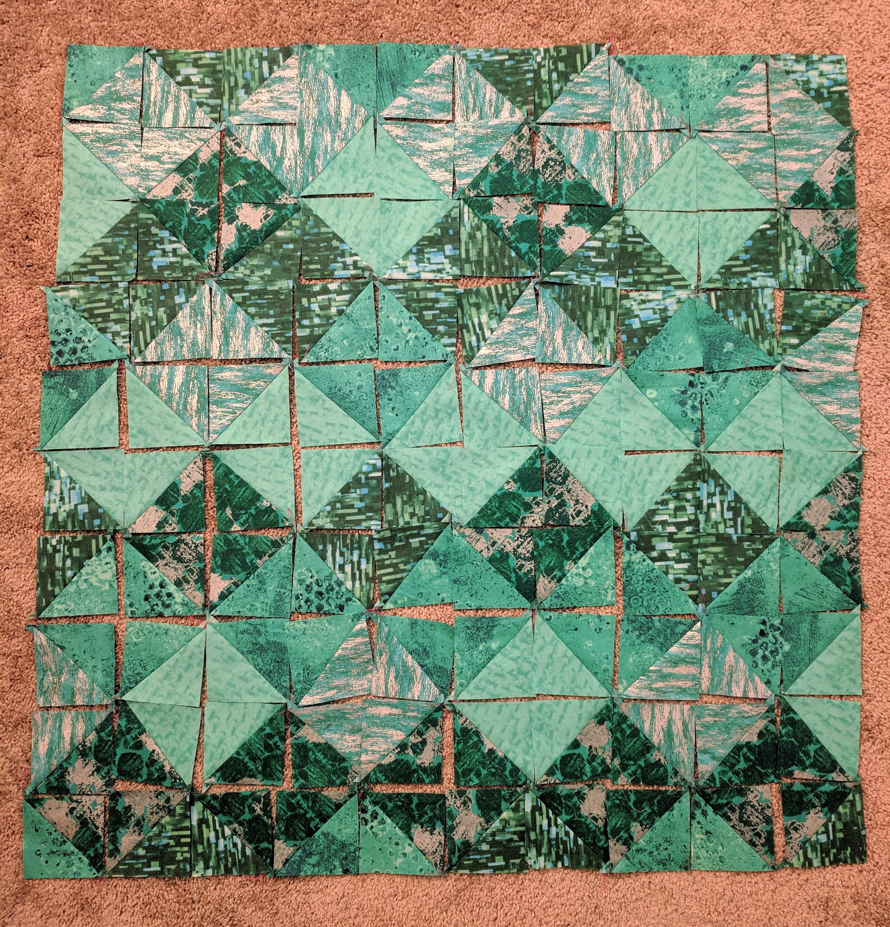 So the Green Diamonds was meant to be a trial “mess up” quilt before I attempted to quilt the rainbow bargello (see next week). I got a cheap 5-fabric fat quarter (18″x21″ piece) bundle from Joann, and cut each fabric into squares. I made half square triangles (HSTs) of each pair of fabrics – so each fabric had a set of HSTs with each other fabric. I decided to lay them out in a fake “on point” design, so that each fabric was represented by a row of diamonds. This created a secondary block, or pattern, between the rows of diamonds that’s diamonds of alternating fabric. I sewed these together in rows, then sewed the rows together. I used some excess fabric for the border.