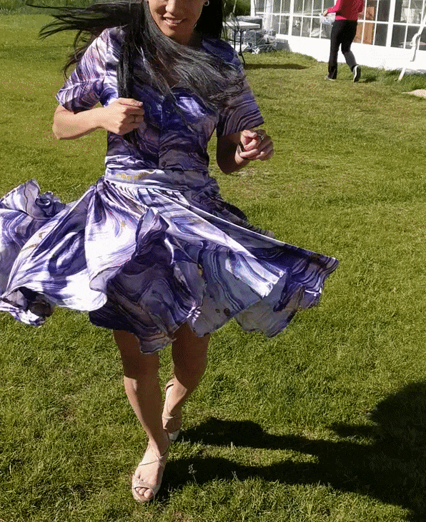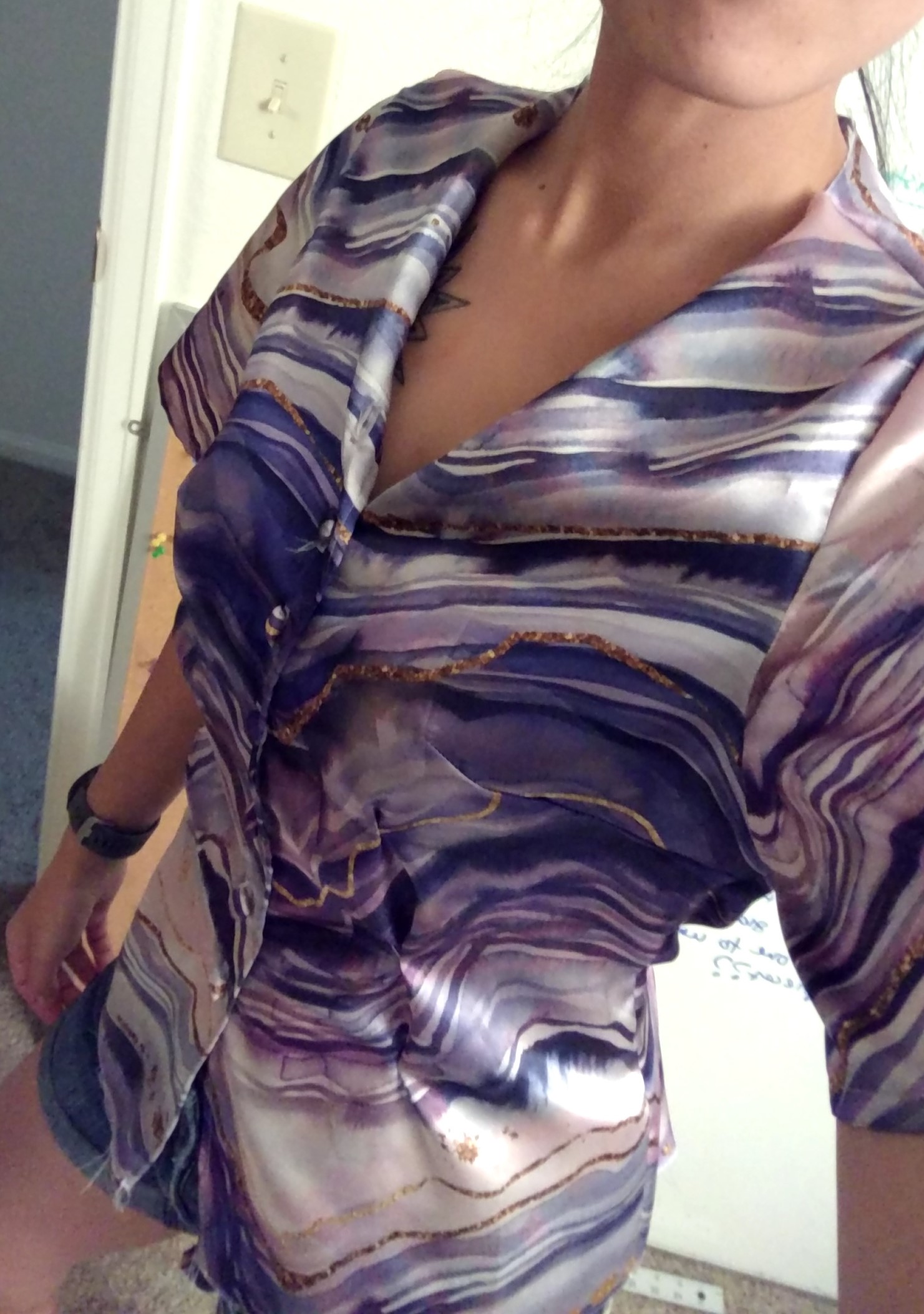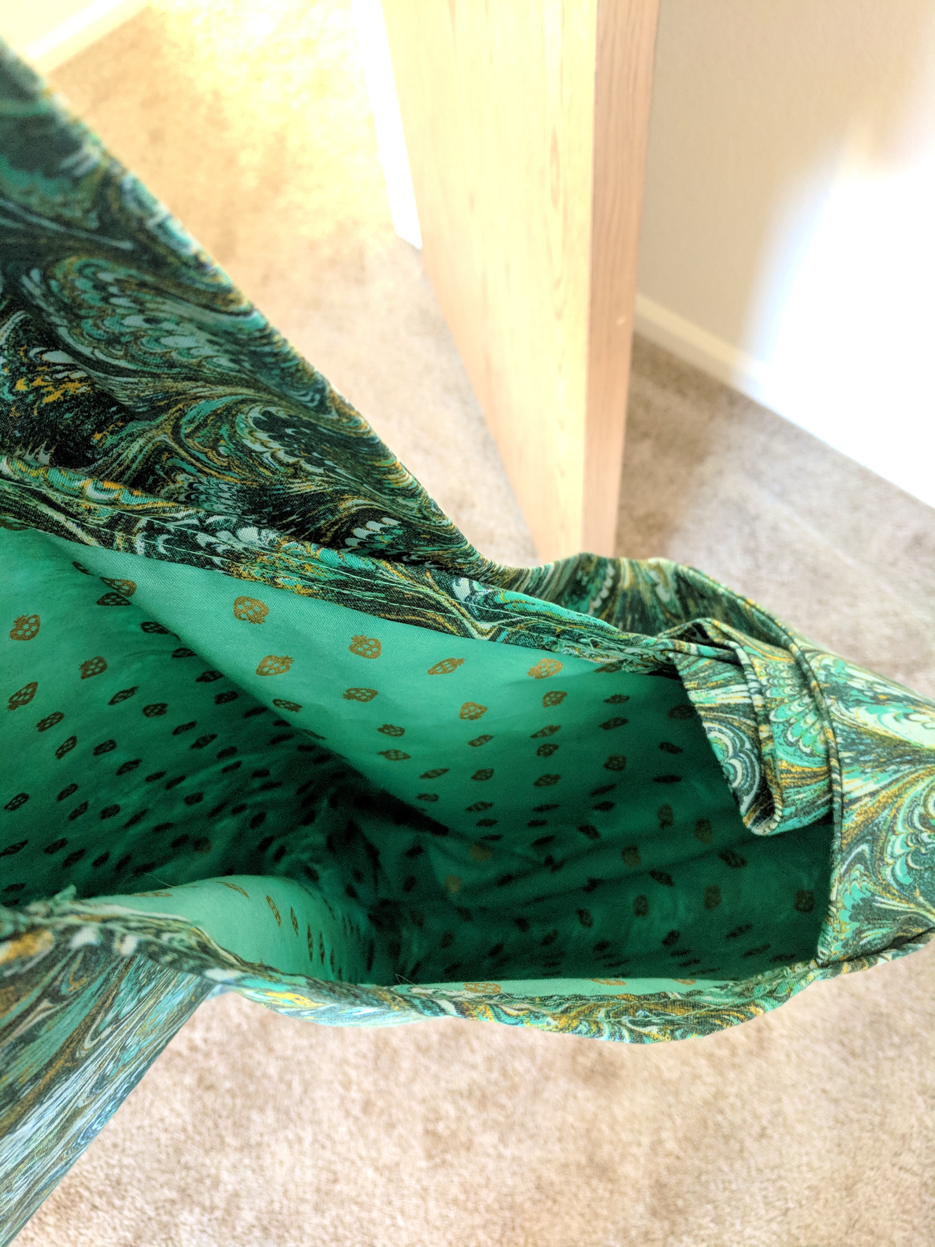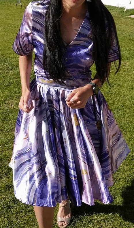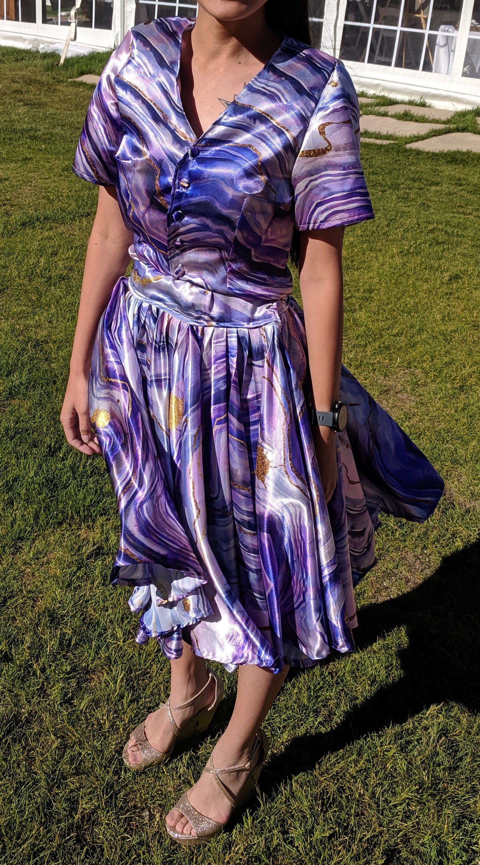 I modified the Lekala #5446 Classical Blouse pattern again, and sewed 3 circle skirts together to get the full volume of the skirt. With the blouse, I constructed the entire thing save for the collar, since I wasn’t sure I wanted to go down that road and have it turn out weird (again). I used buttons that I was able to cover with the same fabric as the shirt (they have a separate back and front, you wrap the fabric around the front, stuff it into the “bowl” of the button, and click the back into place, securing the fabric).