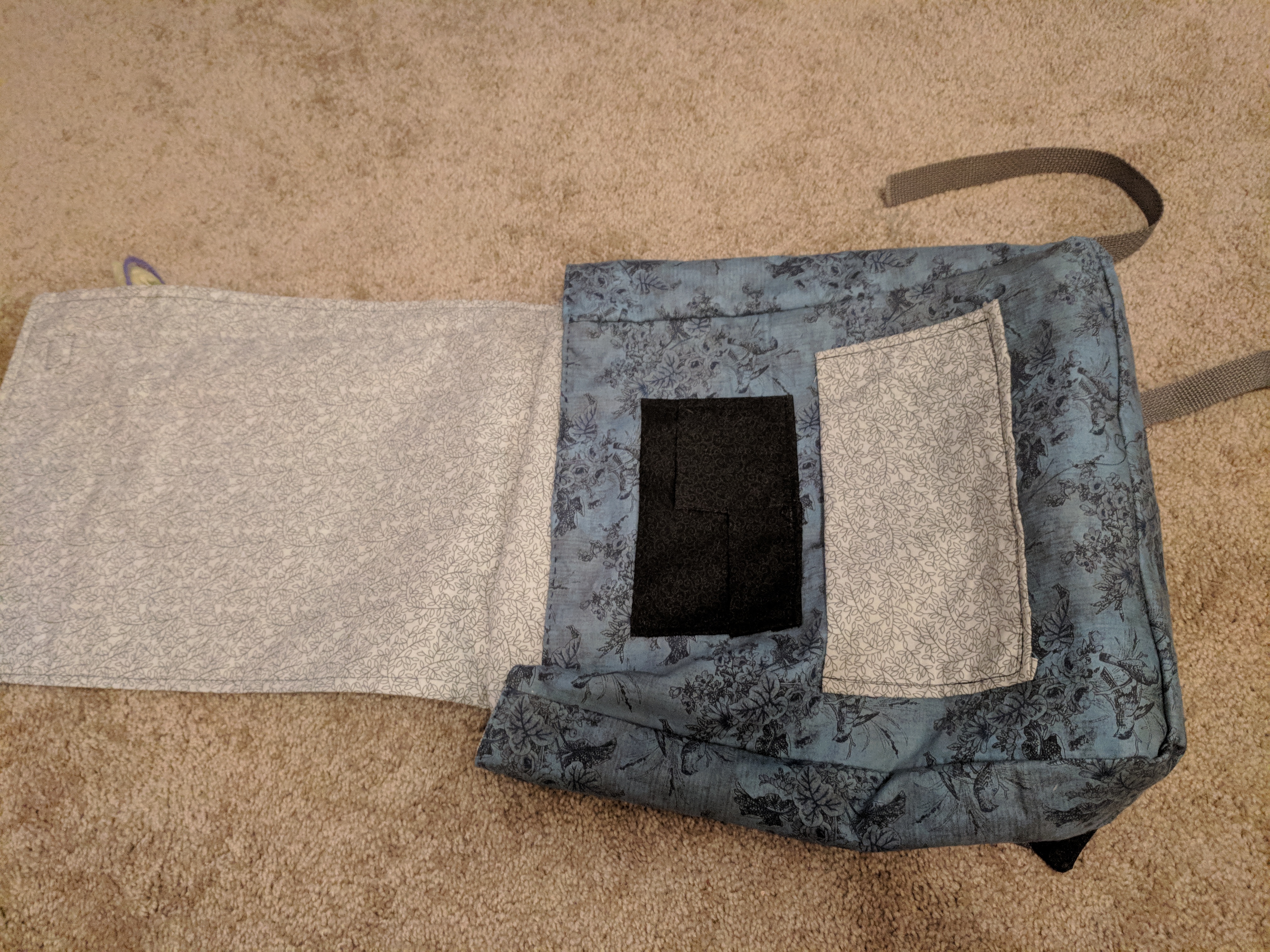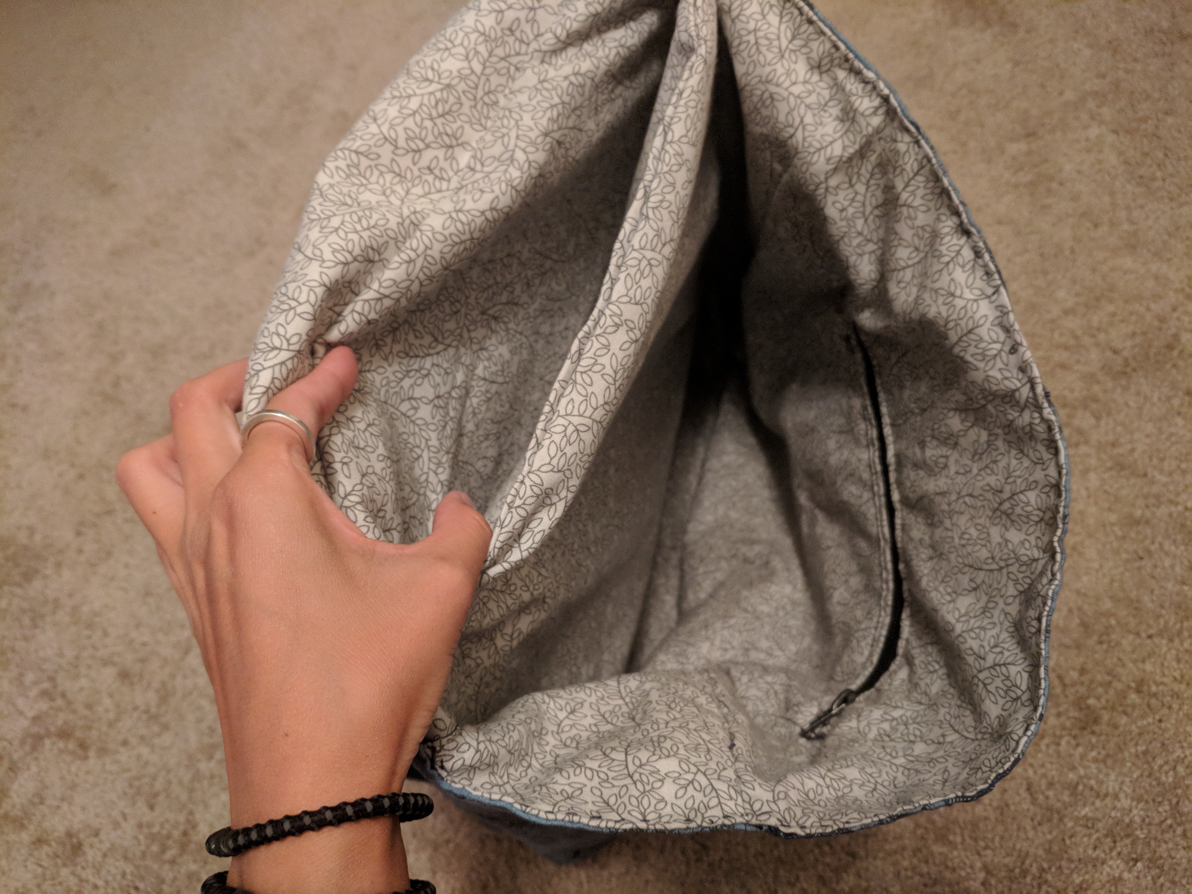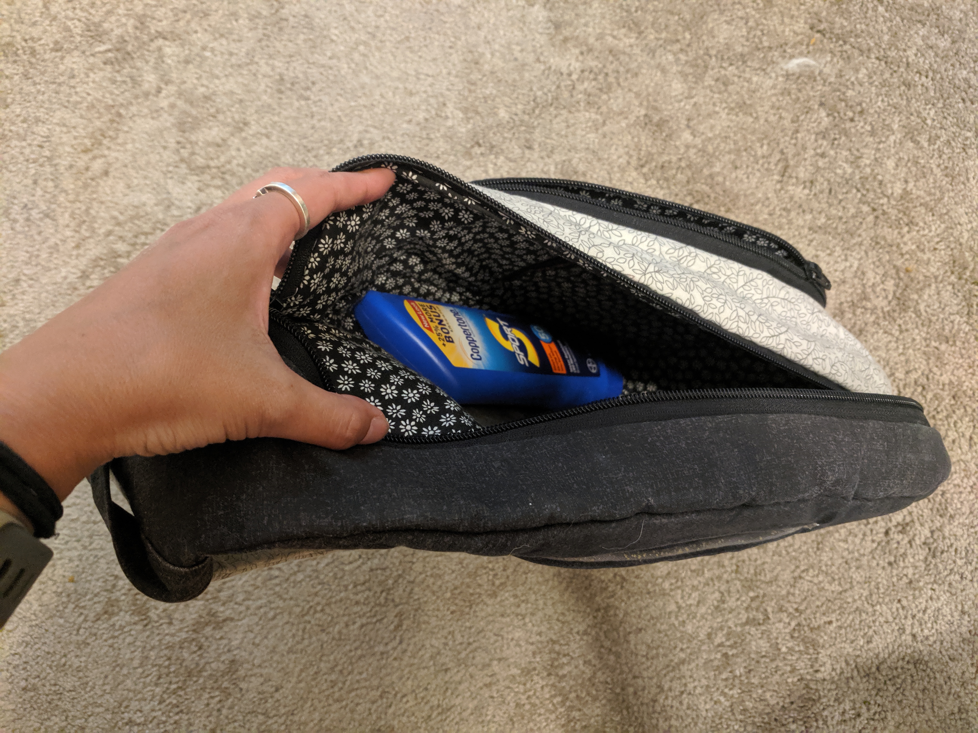 Isn’t the lining fun? Sunscreen for scale.The zippered pocket on the back is where the entire thing was turned right side out when the construction was done.