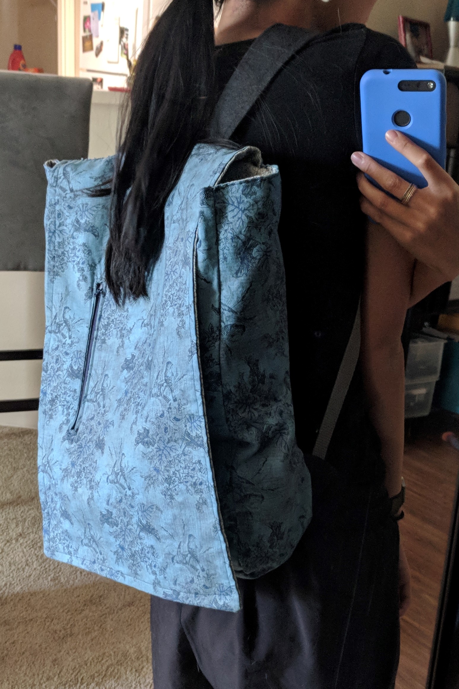 I made this backpack for a friend, we chose the fabric together at Joann and then I constructed it off of the Ruther Backpack pattern from IThinkSewBags on Etsy. I added a laptop sleeve with foam padding, and some additional pockets on the inside flap. This was my first big project using a machine, which I used for most of the construction. I did the top stitching and strap attachments by hand for a homey look.