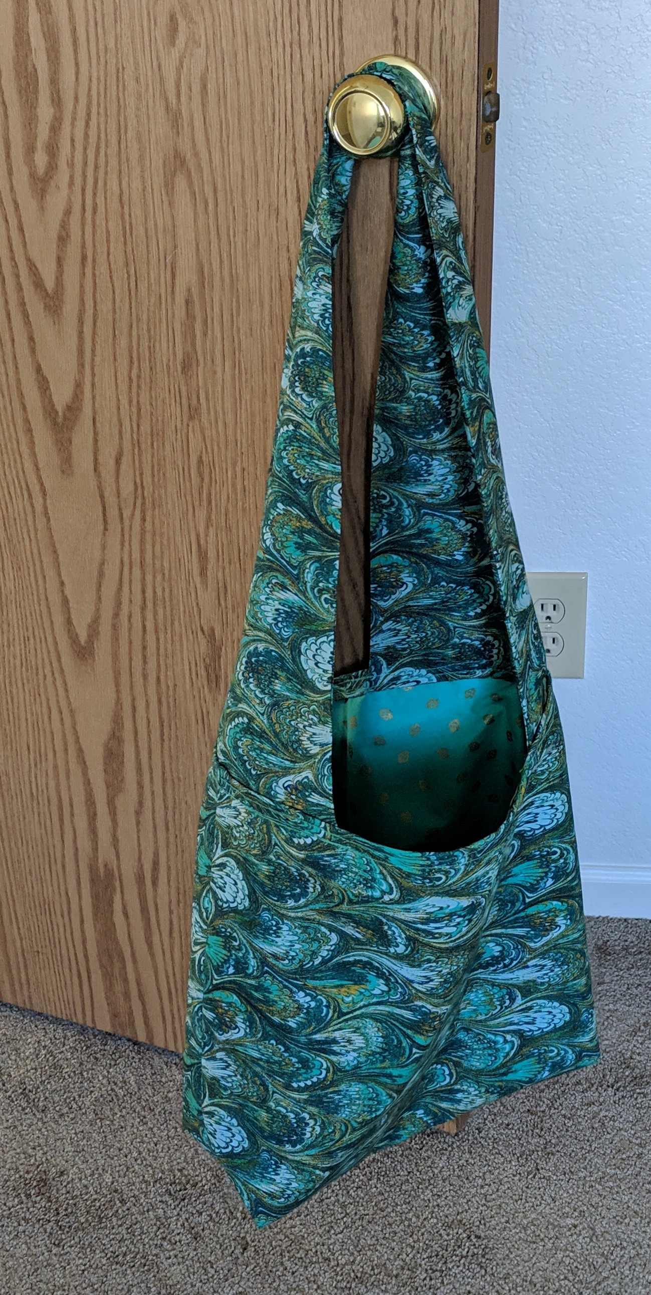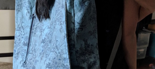 I made this tote bag for my cousin for Christmas – partially inspired by another tote bag she likes to use. I used the 4girlsdesigns shoulder bag pattern with a fun marbled outer fabric inspired by a paper marbling experiment we did together, and cute strawberries for the inner lining. Project completed November 18, 2018.