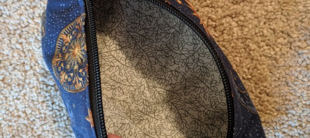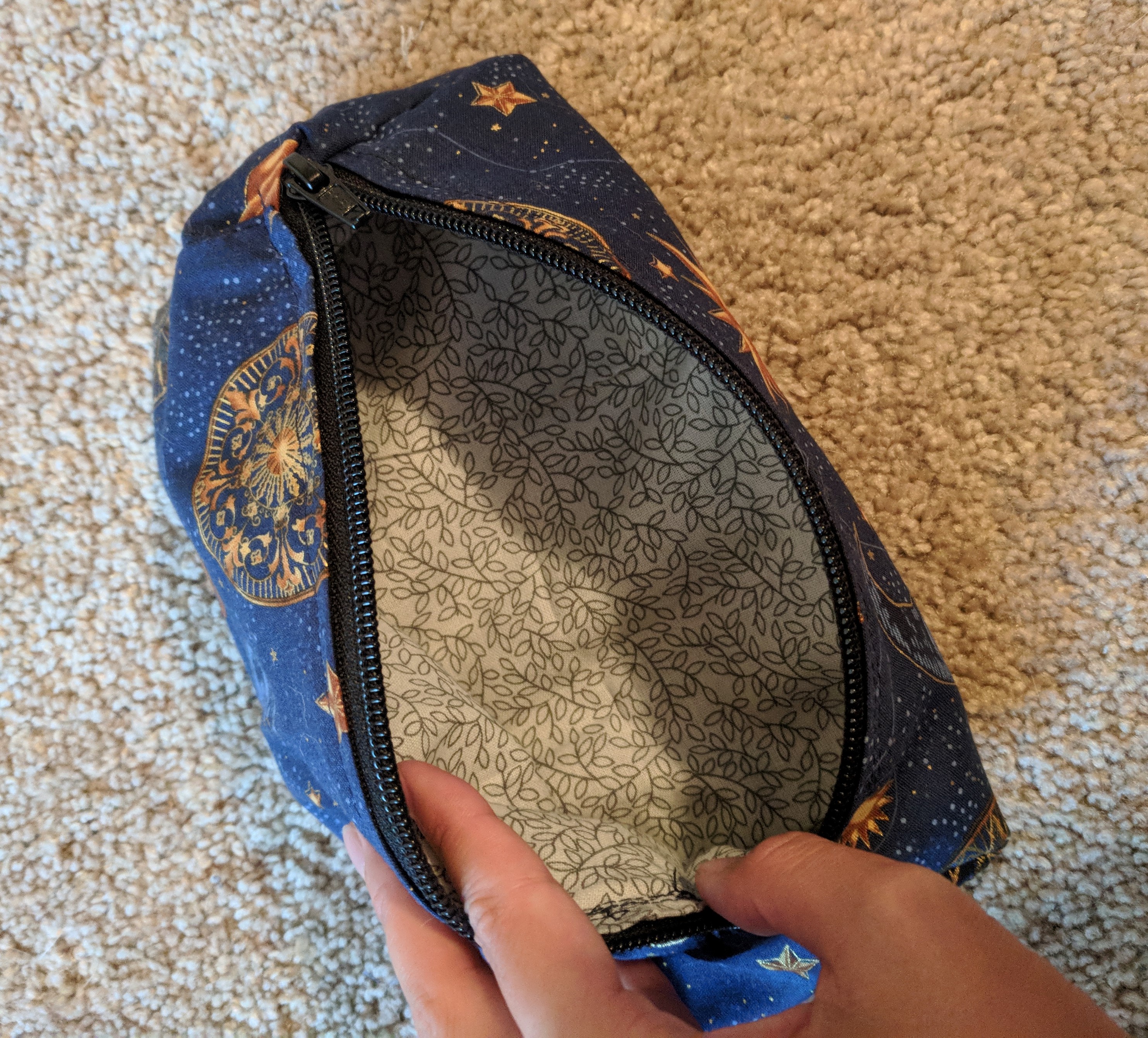 I self-drafted this little zipper bag for a friend for her D&D dice 🙂 It’s a triangular prism, and fully lined. She’s super into space stuff so the outer fabric is suns and stars. Project completed July 4, 2018.