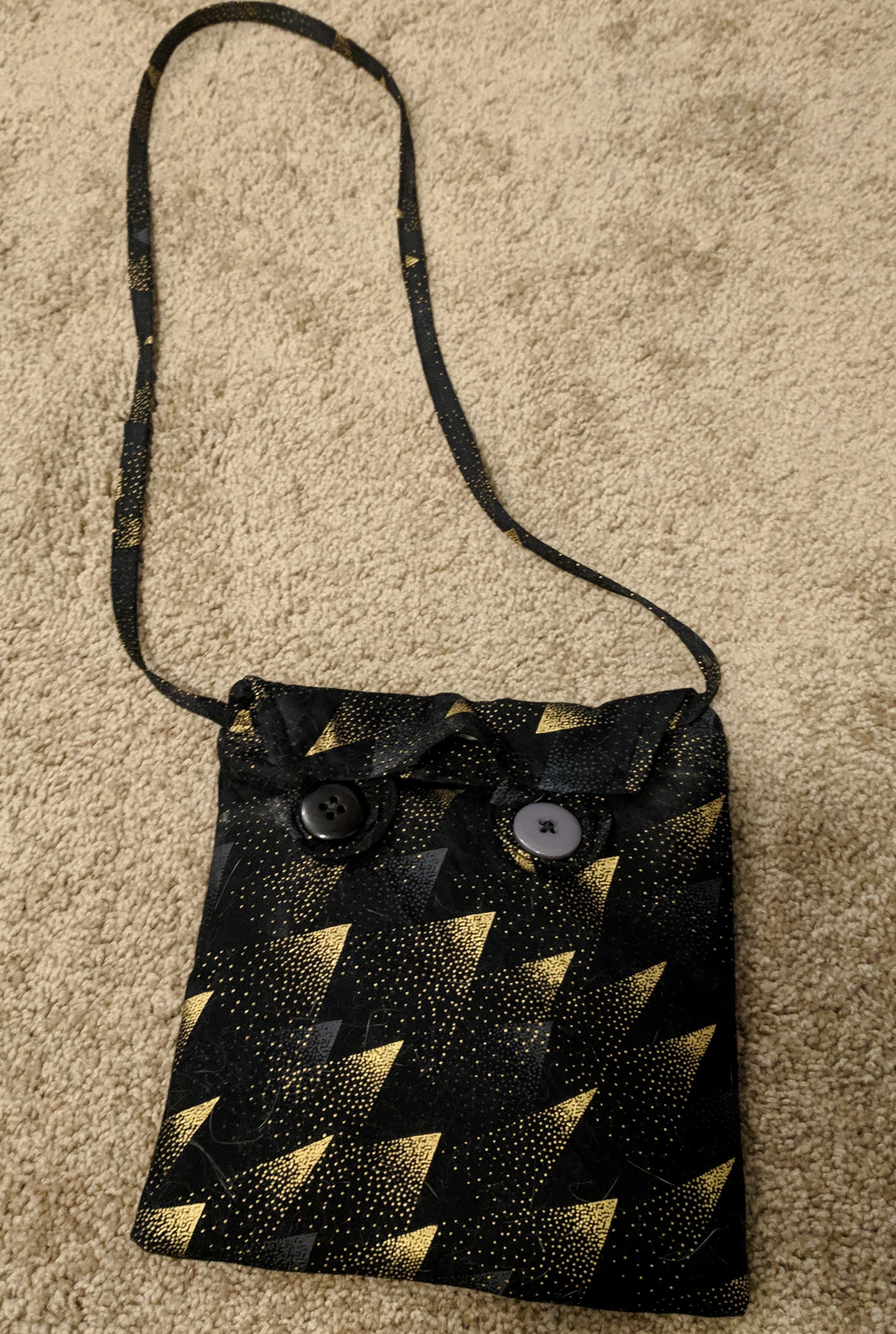 I self-drafted this little black and gold purse using some scrap fabric since I needed a purse that was in between casual and fancy. The top is closed with two buttons and fabric wrapped around little elastic strips. I made it the perfect size to keep all my things inside, and the only thing I’d do differently in the future is have a thicker strap. Project completed March 5, 2019.