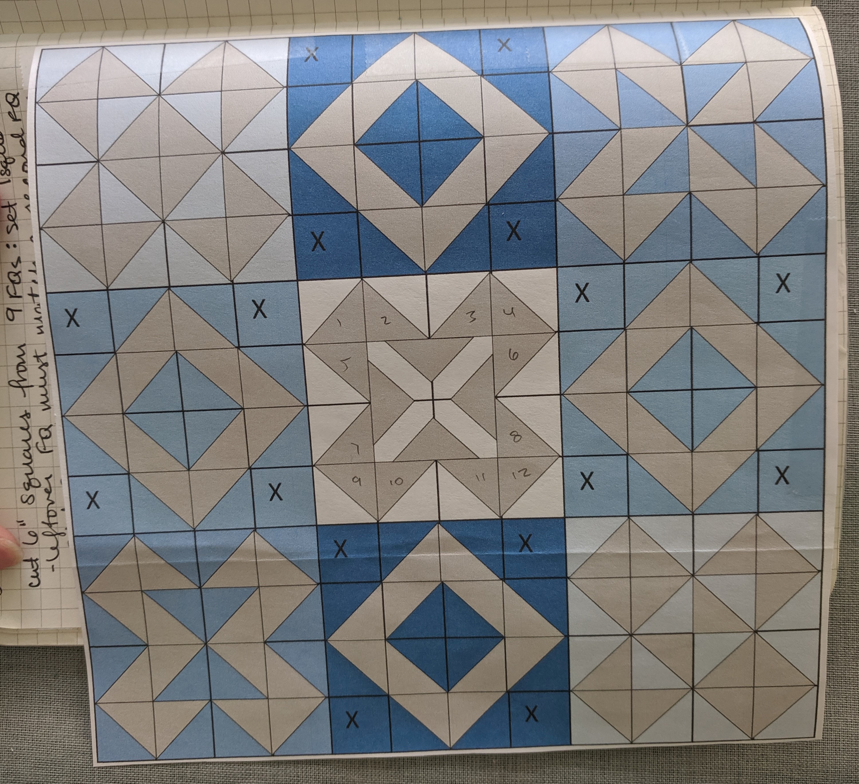 I ended up quilting the whole quilt with “stitch in the ditch”, where you quilt between units along the seam lines. For this to work, you have to iron both seam allowances to one side (instead of open). This makes one side of the seam a bit taller than the other, and the quilting goes on the lower side – the ditch. I used some scraps and the same background for the border, and quilted little heart shapes around the entire thing.