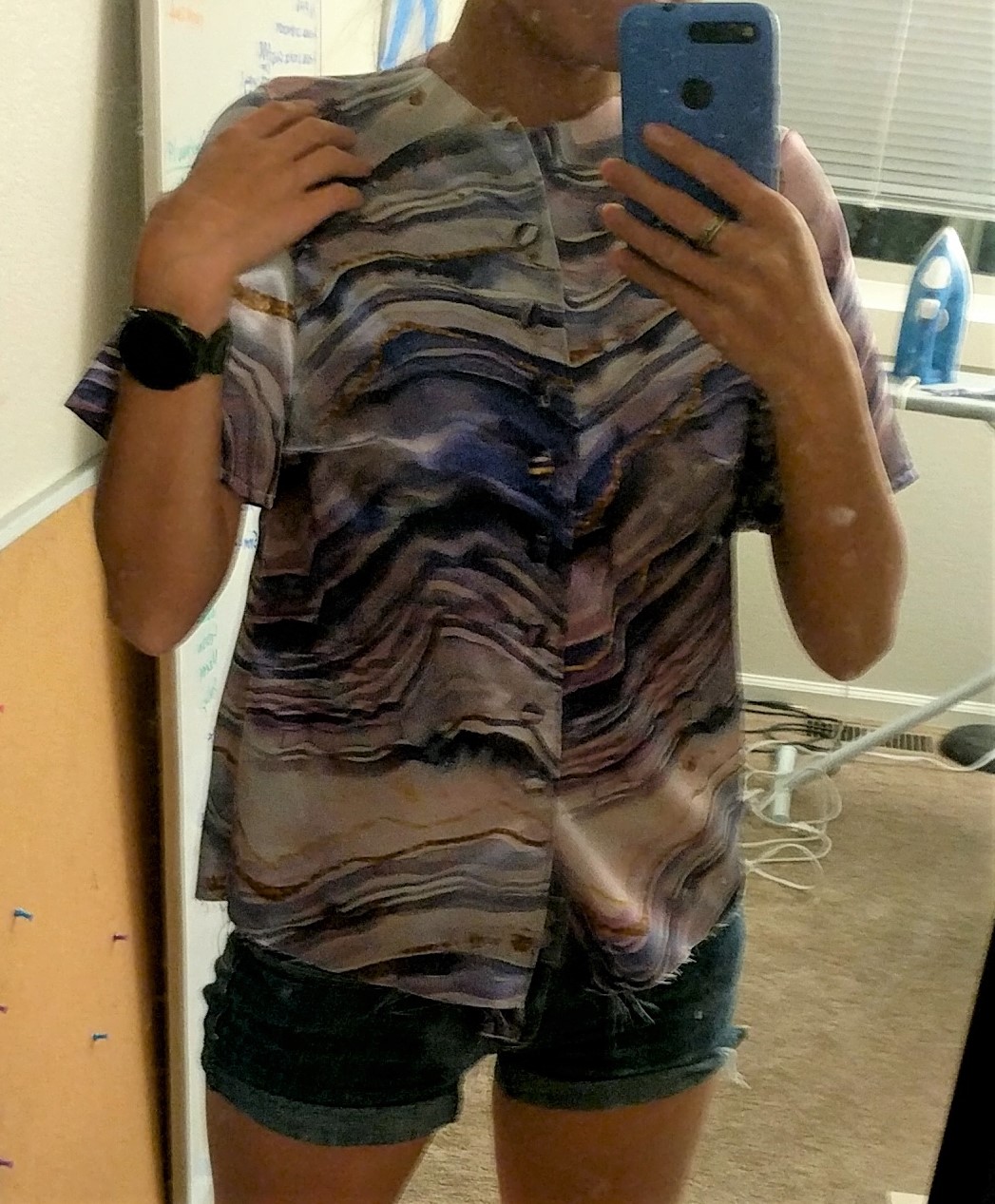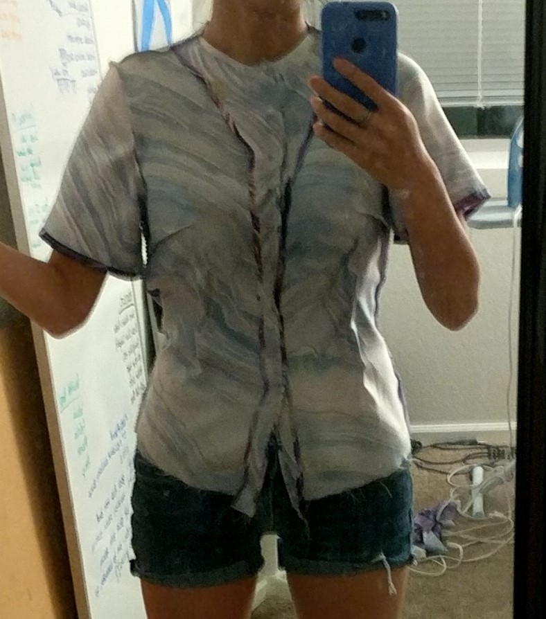 I used improv fitting while the shirt was on my body to create darts that (a) flattered me and (b) ensured there wouldn’t be wrinkles when I tucked the shirt into the skirt. I pin inside out so that I can sew the darts directly, which assumes my body is symmetrical, and no one’s body is, but it’s close enough.