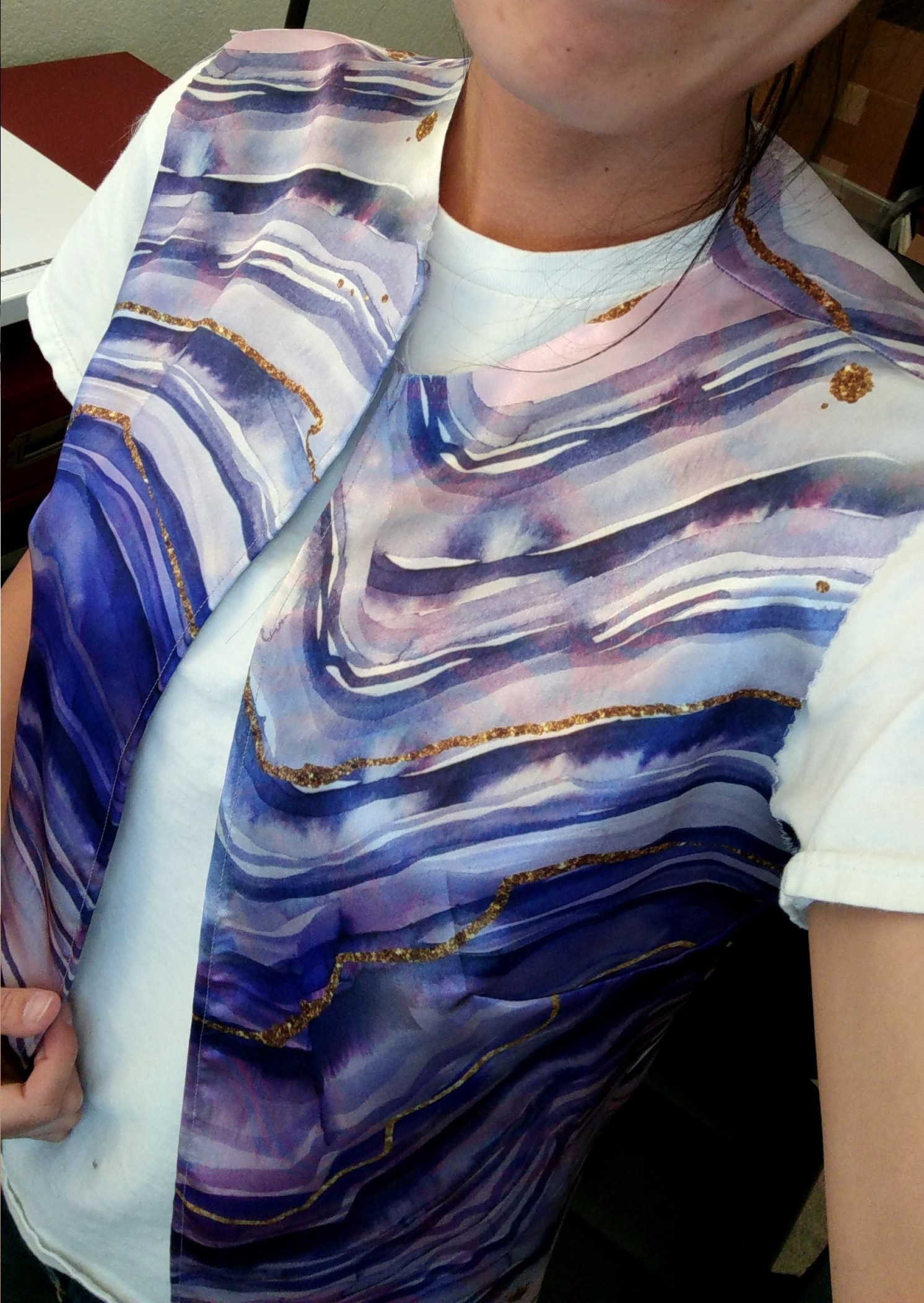I made this top + skirt for a friend’s wedding. I got the fabric from Spoonflower, a site that takes designs and can print them on many different fabrics. I chose a polyester satin that turned out to be a bit slippery. I used tissue paper to stabilize the fabric and ensure it didn’t fall down the hole in the machine where the needle goes through or stretch out. It worked super well, but was kind of annoying since I had to sandwich each seam in tissue paper, sew, then rip the tissue paper off.