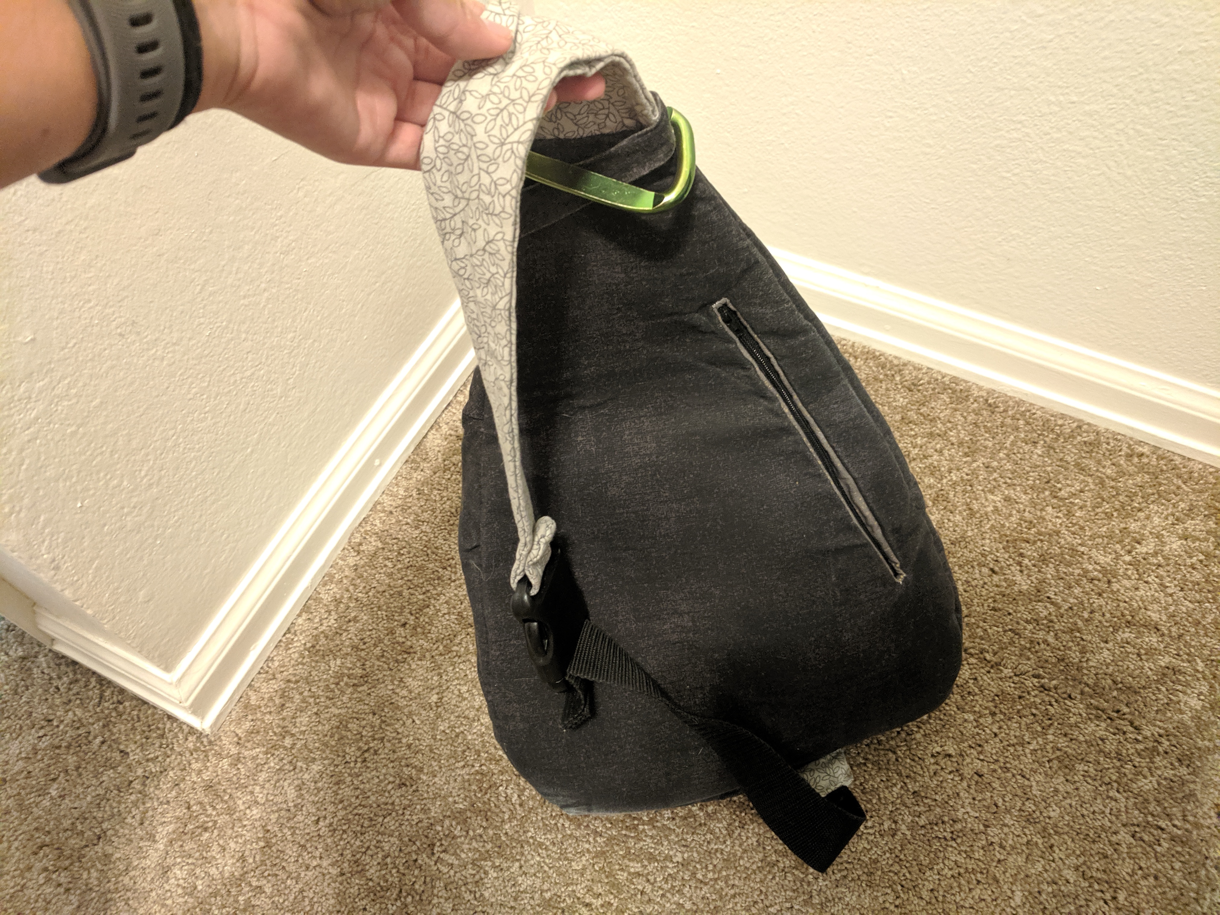 I used a buckle on the strap so I could, theoretically, un-clip it from myself and/or clip it onto something. I added a little band at the top which is usually holding a carabiner to hold jackets, shopping bags, hats, etc.