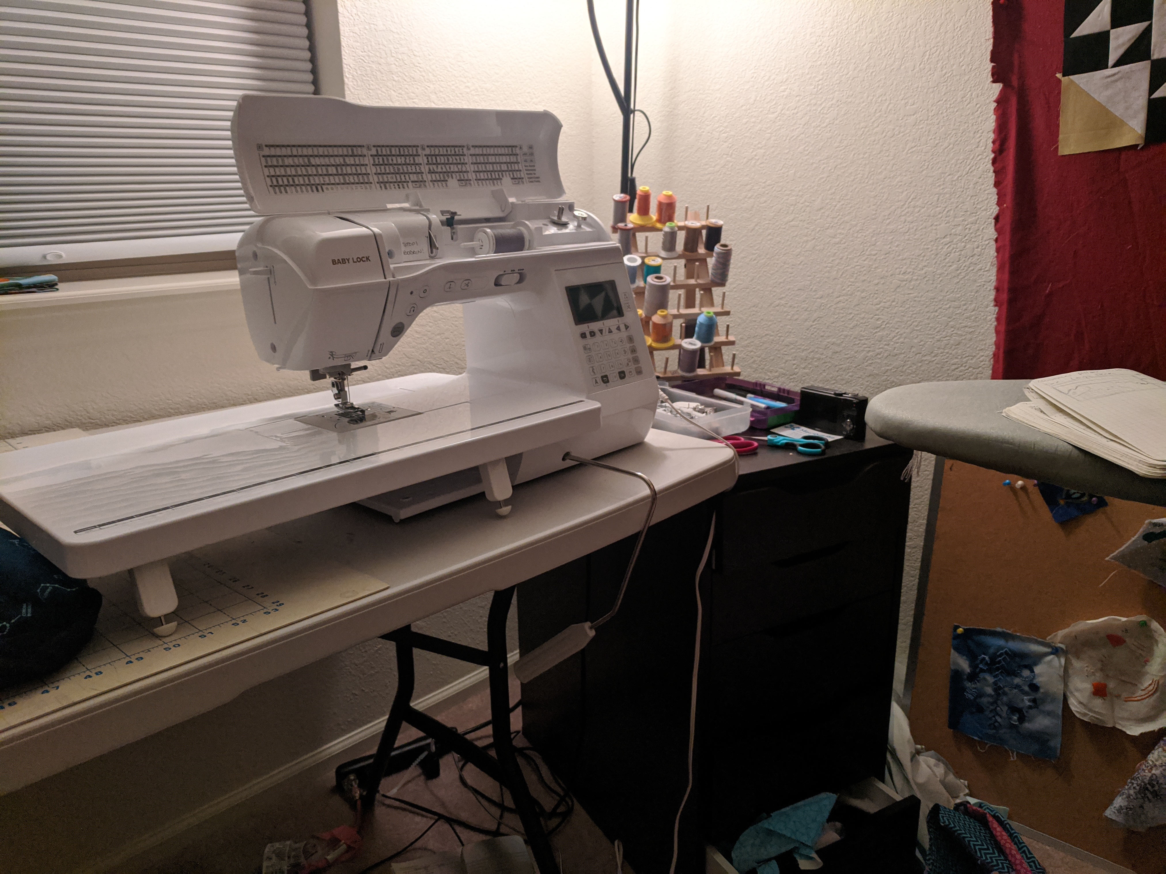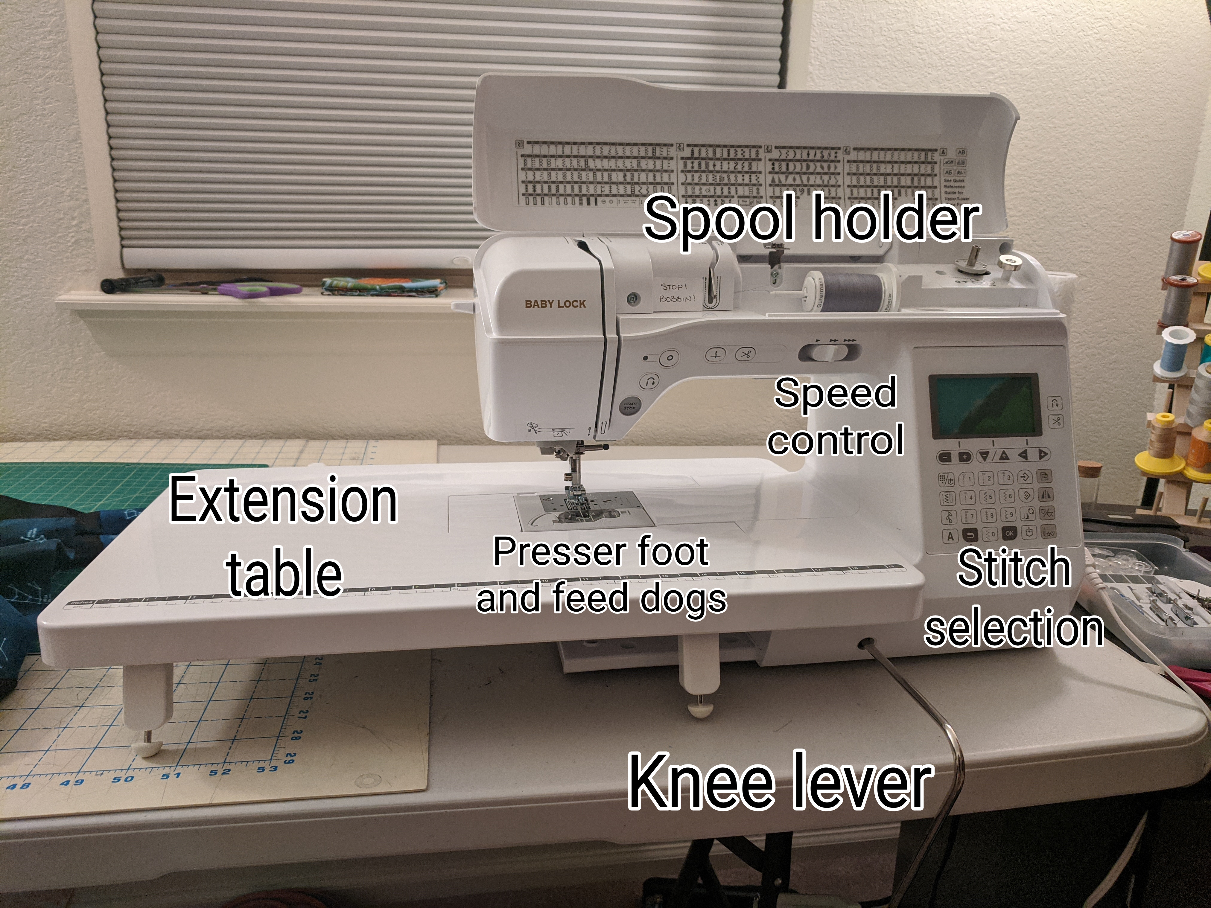 It came with an extension table, which allows the fabric to lay flat as it gets sewn together; it makes it easier to guide the fabric through and prevents gravity from pulling the piece away from the needle. The extension table is near necessary for quilting, especially free motion since any gravitational pull will increase strain on the fabric and effort for me. Foot pedal controls the speed, spool holder holds the thread as it’s being used, and if I have a big spool I have a different attachment for it. You’ve seen the throat before in the Night Sky post, but this is where I have to stuff half the quilt as I quilt it. I’m always trying to quilt to my right so the fabric within the throat decreases over time. The knee lever allows me to raise the presser foot without using my hands, which is useful if I have to finagle something through the needle with both hands, or even if I’m just grabbing other stuff. The presser foot is the thing that secures the fabric to the table as it goes through the machine, so I raise the presser foot to turn corners or remove the fabric from the machine.