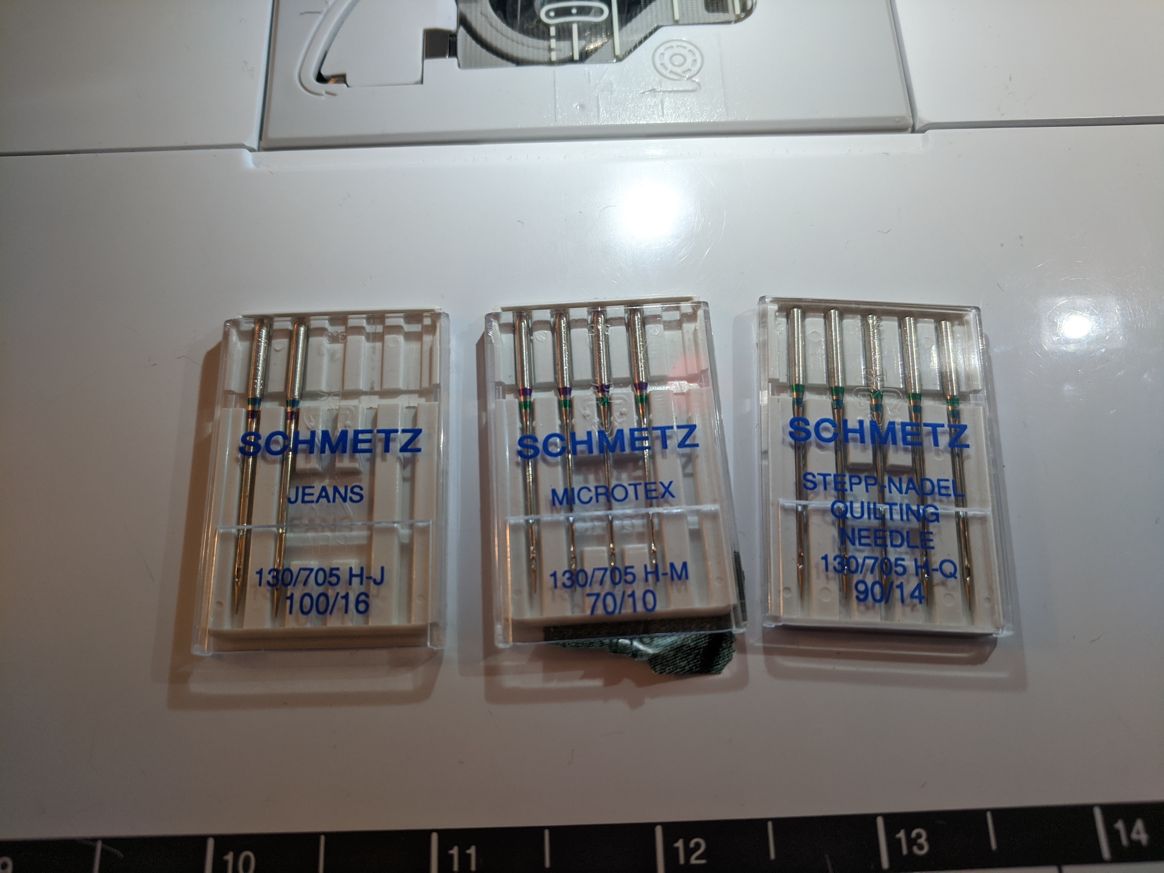 There are many different sizes and types of needles, I usually use a 70/10 for quilting and piecing, unless I’m using a thicker thread in which case I need a thicker needle. Microtex or sharps are useful for cotton, but they make ball point or duller needles for jersey and knit fabrics so the needle doesn’t break any threads. Over time, needles get dull, or I run over a pin and break them. They recommend using a new needle for every project, but it ends up being every two-ish projects for me.