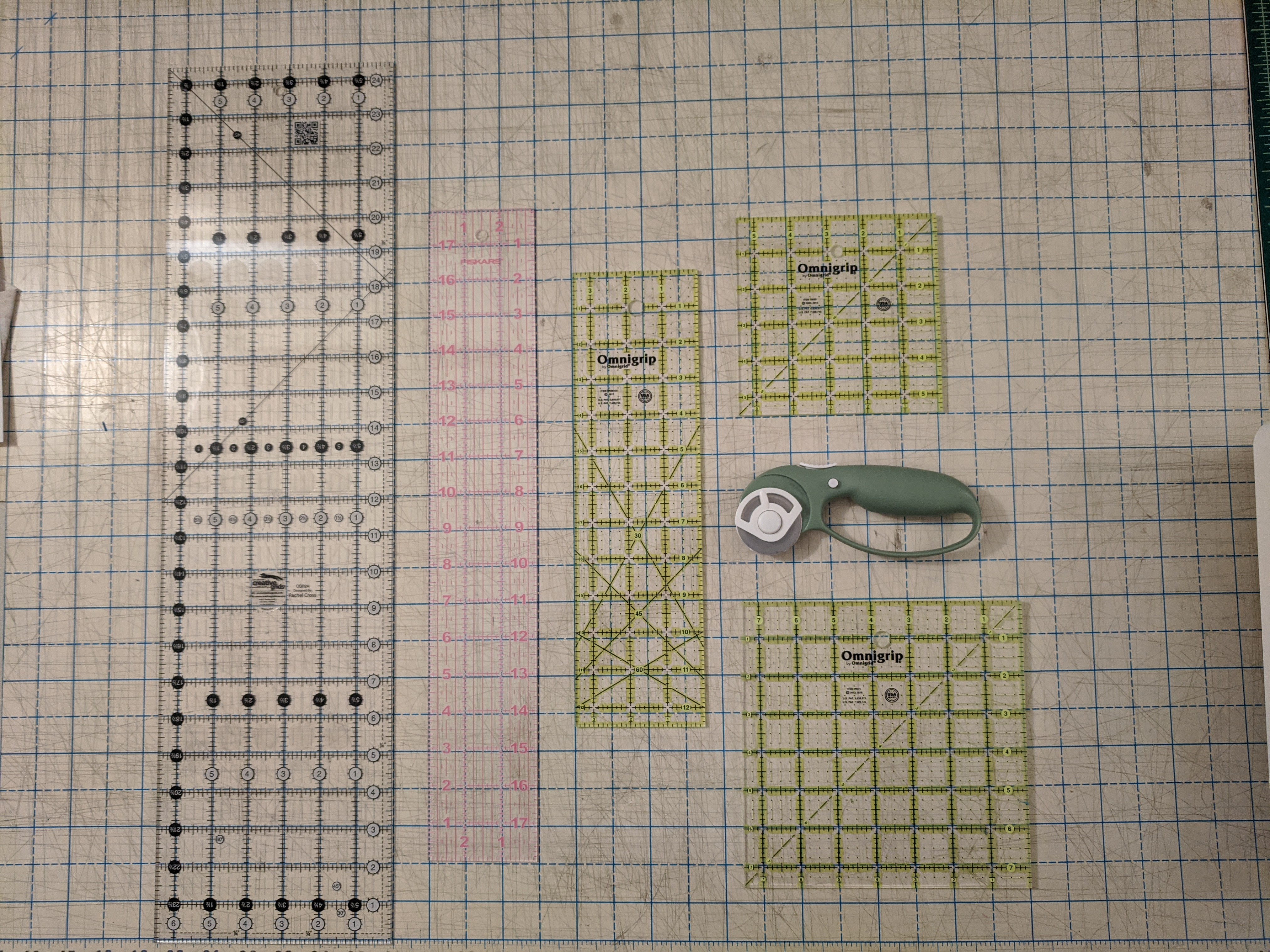 My rulers! So necessary for quilting, since everything is on a grid. Rulers are mostly used in conjunction with the rotary cutter and mats, which make cutting up fabric so easy. I have the big white mat that takes up half my table, and a few other mats that are smaller.
