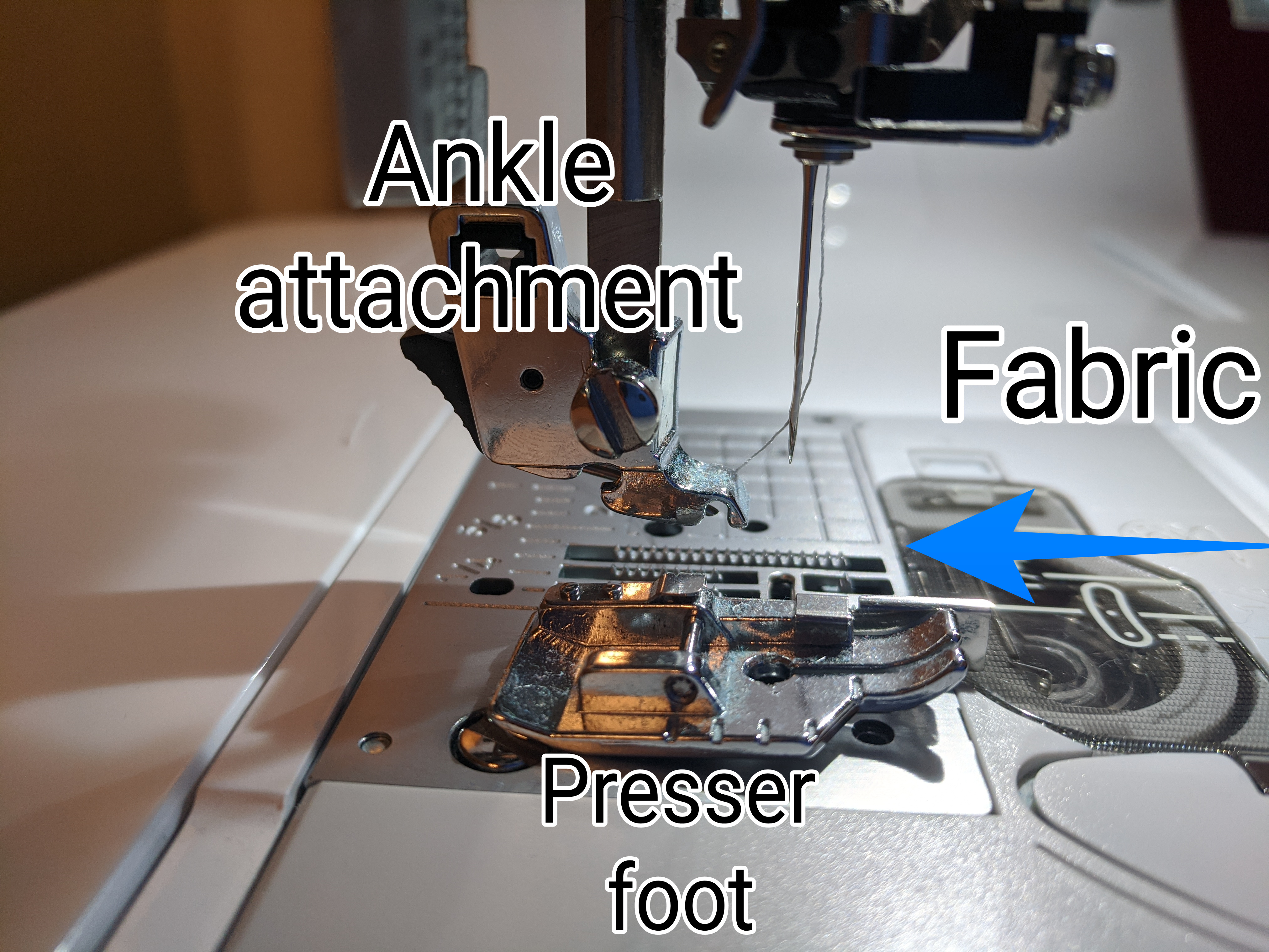 Here are some of those presser feet. They sit on the “ankle” of the machine and help the sewist guide fabric appropriately. The ¼” foot has a guide for where to put the edge of the fabric so the needle is ¼” away, which is the seam allowance most quilters use. The open toe foot allows you to see the needle as it goes down, and can be used for fancy stitches. The walking foot has its own ankle attachment and uses plastic pieces to guide the top of the fabric through the machine at the same rate as feed dogs on the bottom (more on that next). The free motion foot allows the fabric to move around easily, and the feed dogs are disengaged.