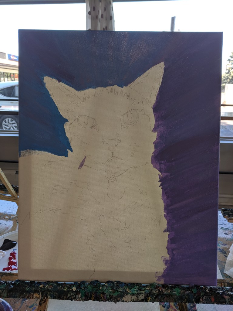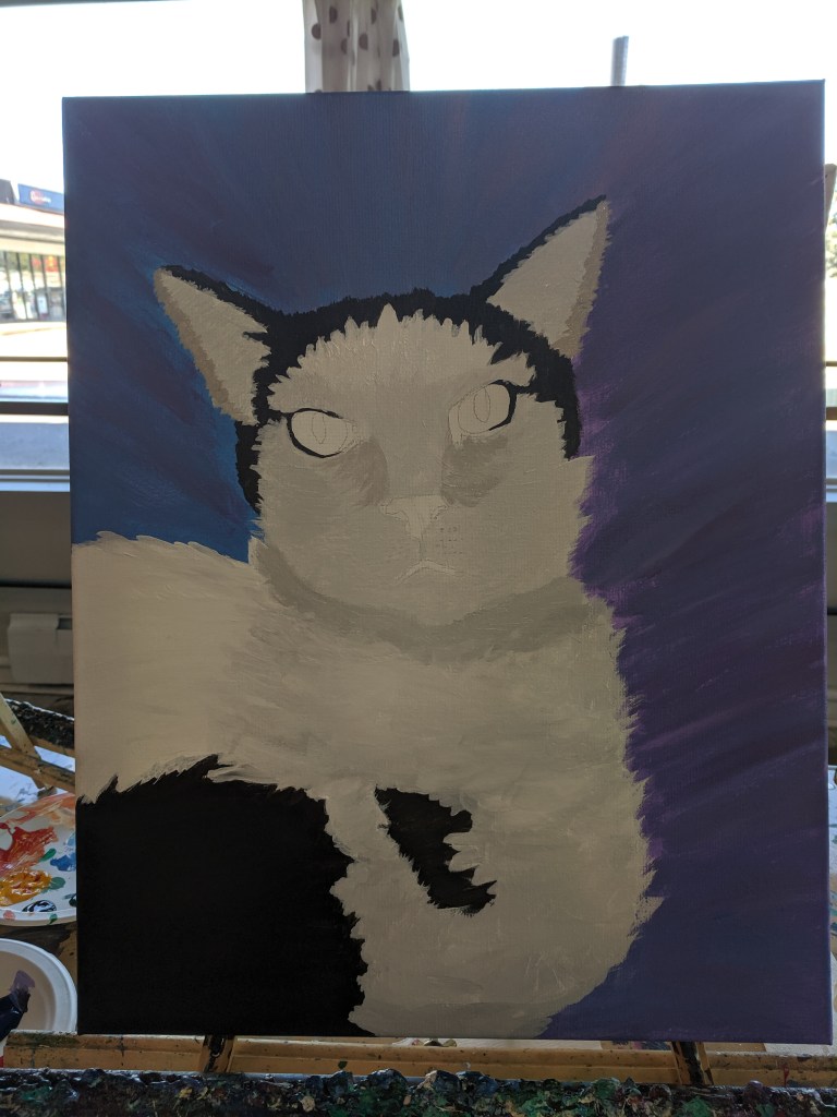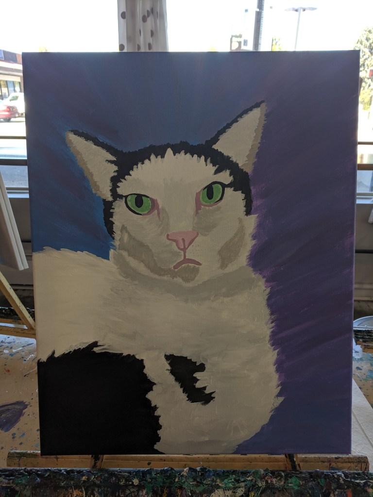 My friend and I went to Sipping N Painting in Denver, one of the pretty standard paint and drink places 🙂 Except they used a photo of our pet to sketch the outline on a canvas for us, and then we filled it in!
