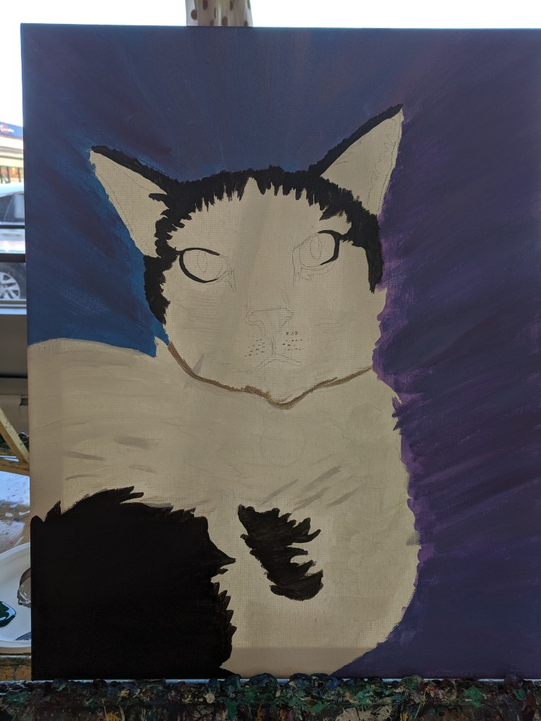 It was originally supposed to be more of an abstract thing using one color in different shades to define highlights and lowlights within the picture, but I decided that I’d do realistic colors (along with the other 3 people in the class) since my cat is just black and white.