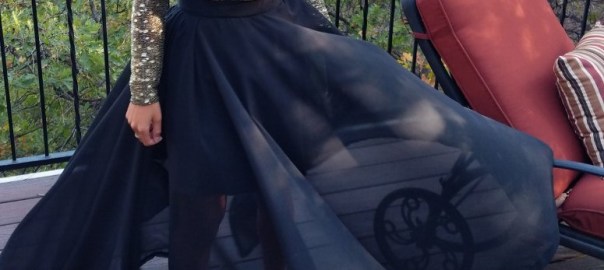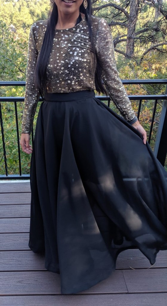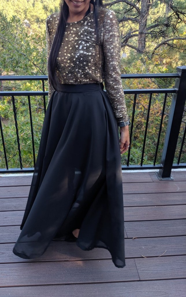 This is a make from a while ago! The fabric is a poly chiffon/crepe de chine from Colorado Fabrics, a wonderful (but overwhelmingly large) store. I wanted to make a circle+ skirt, this is close to a circle and a half. It’s sheer, so I usually wear a long black, gray, or short black skirt underneath. I really love the way it moves, it’s so light and flowy. It is a ton of fabric though – I used about 4 yards and picking it up to go up stairs can be a hassle!