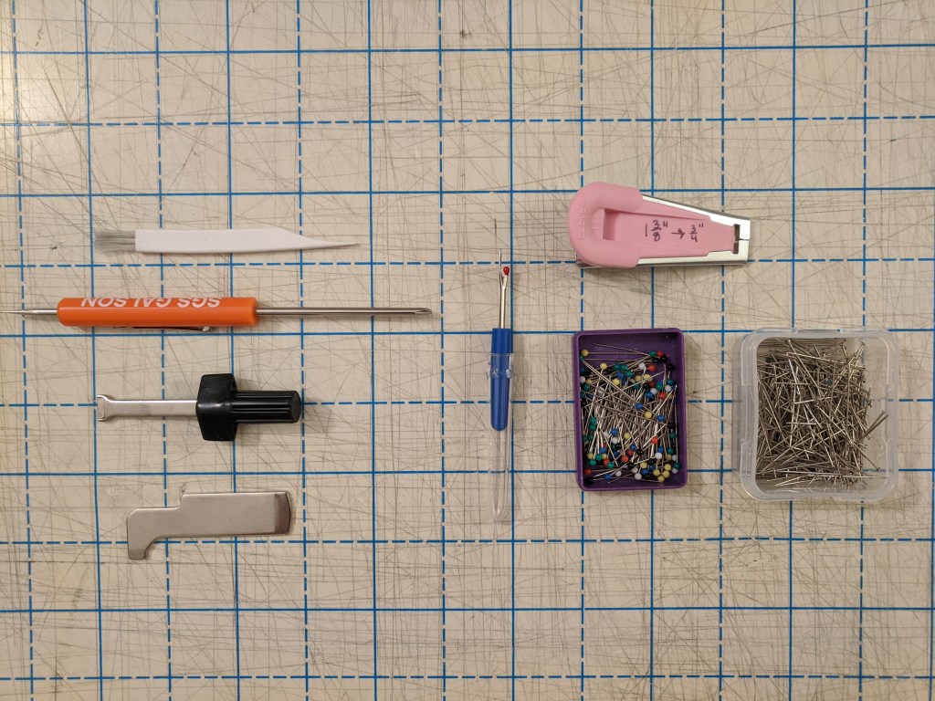 As with rulers, there are many different scissors 🙂 I mostly use them for getting bits of thread and cutting batting. That said, paper dulls scissors very quickly, so fabric scissors are for fabric only! I use little ball head pins and satin pins (far right) to hold fabric together, usually for garments. I don’t usually pin when quilting. I also have my maintenance notions – the lint brush (top white) and various screwdrivers help me clean the inside of the machine from the lint that gets stuck in there. In the middle is my seam ripper, ever useful. The pink thing make bias tape, I can cut a strip, feed it through, and it folds the edges over for you.