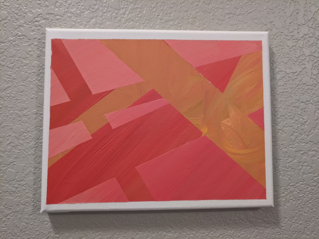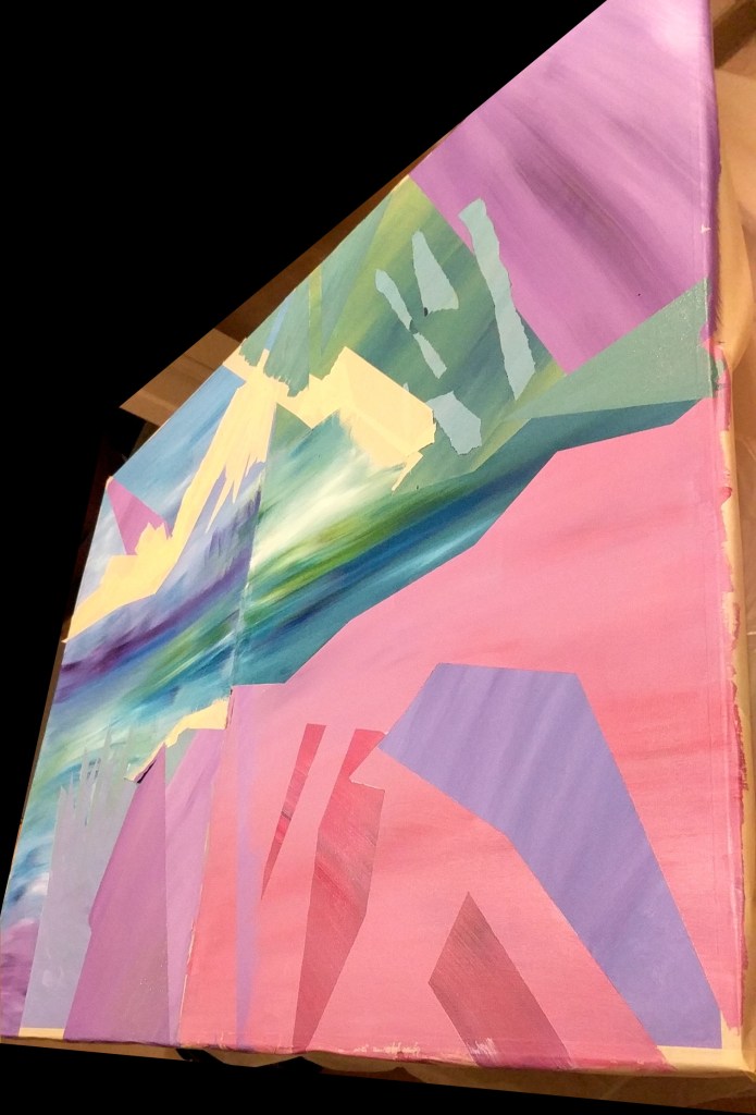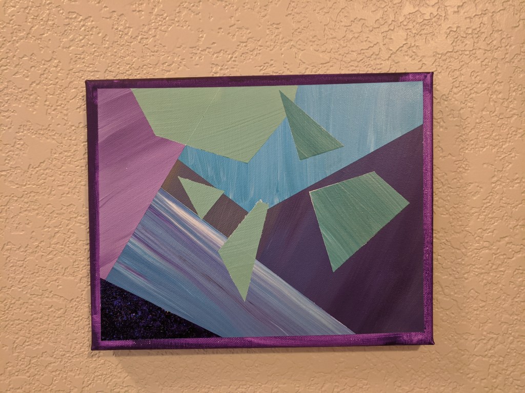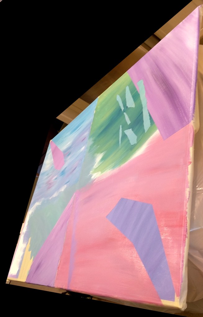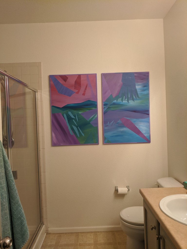 So these started out as a project for my bathroom, since I had a big wall to fill but buying something ~50″ can be expensive. I taped these two canvases together and then used masking tape to create different shapes and straight lines.