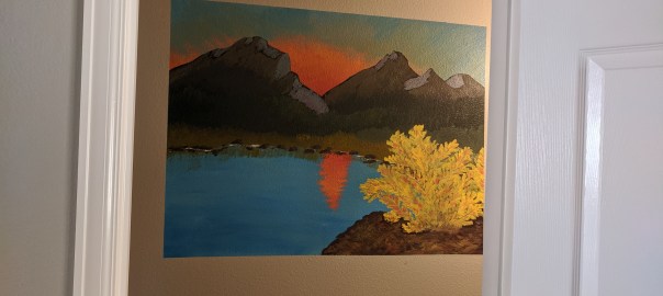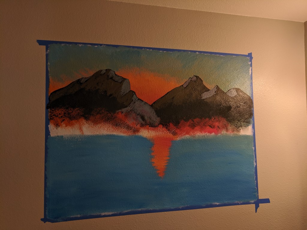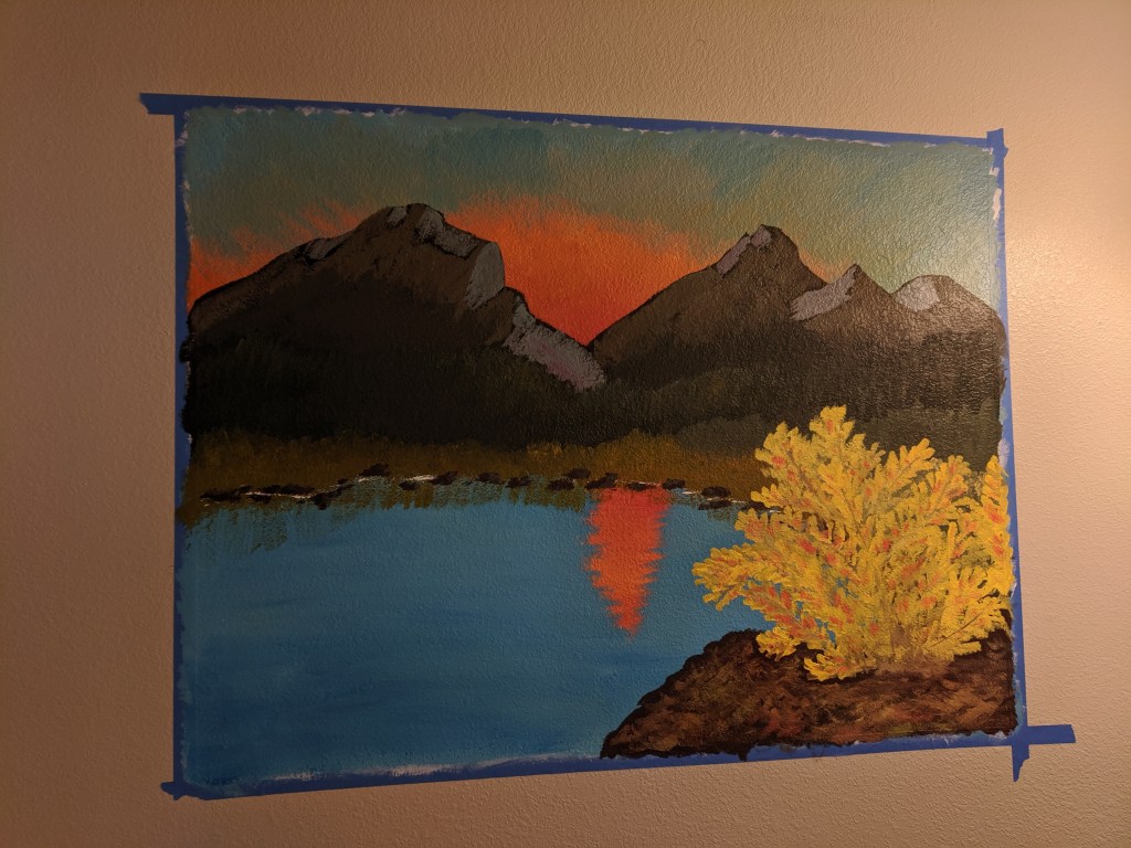 I painted this mural as a combination of a Bob Ross / Rocky Mountain National Park / Glacier National Park homage 🙂 My downstairs bathroom used to be a total gray box and I wanted to fill the space without spending a ton of money. It finished up at about 43″x47″. I used acrylic paint and paintbrushes from Michael’s and some painter’s tape.