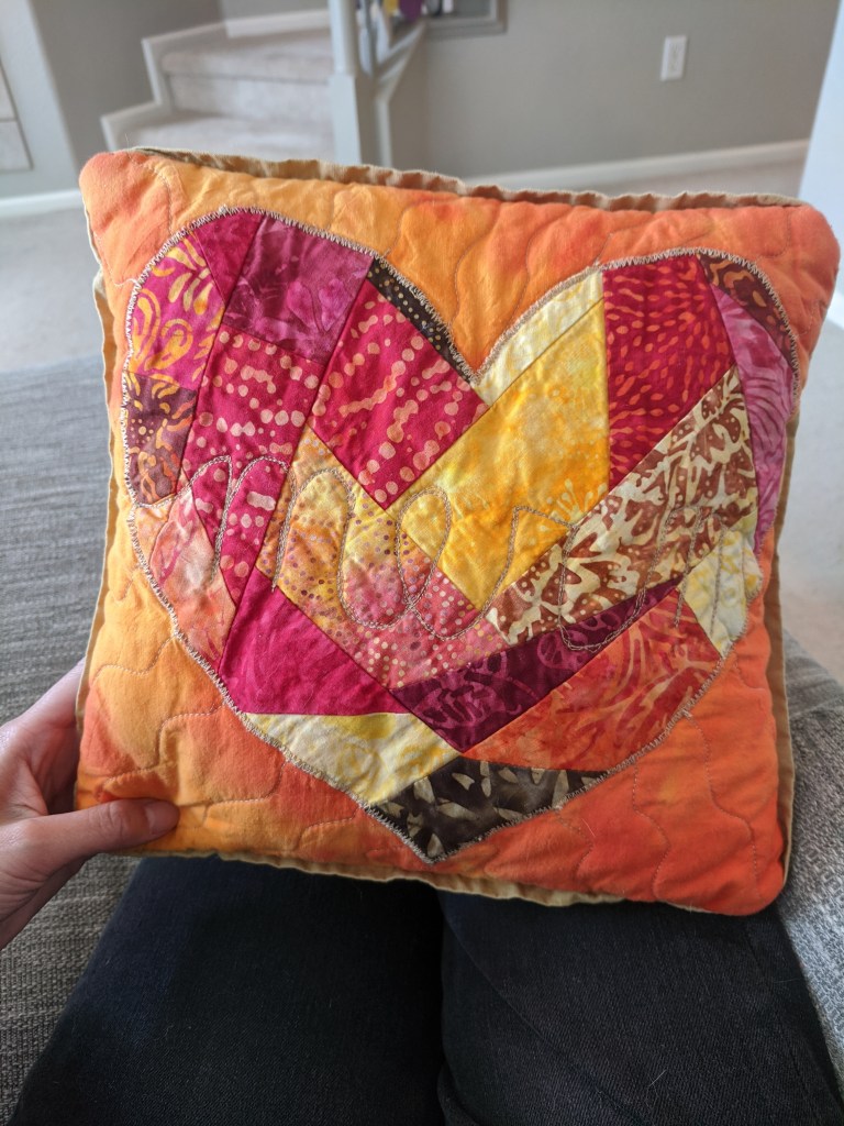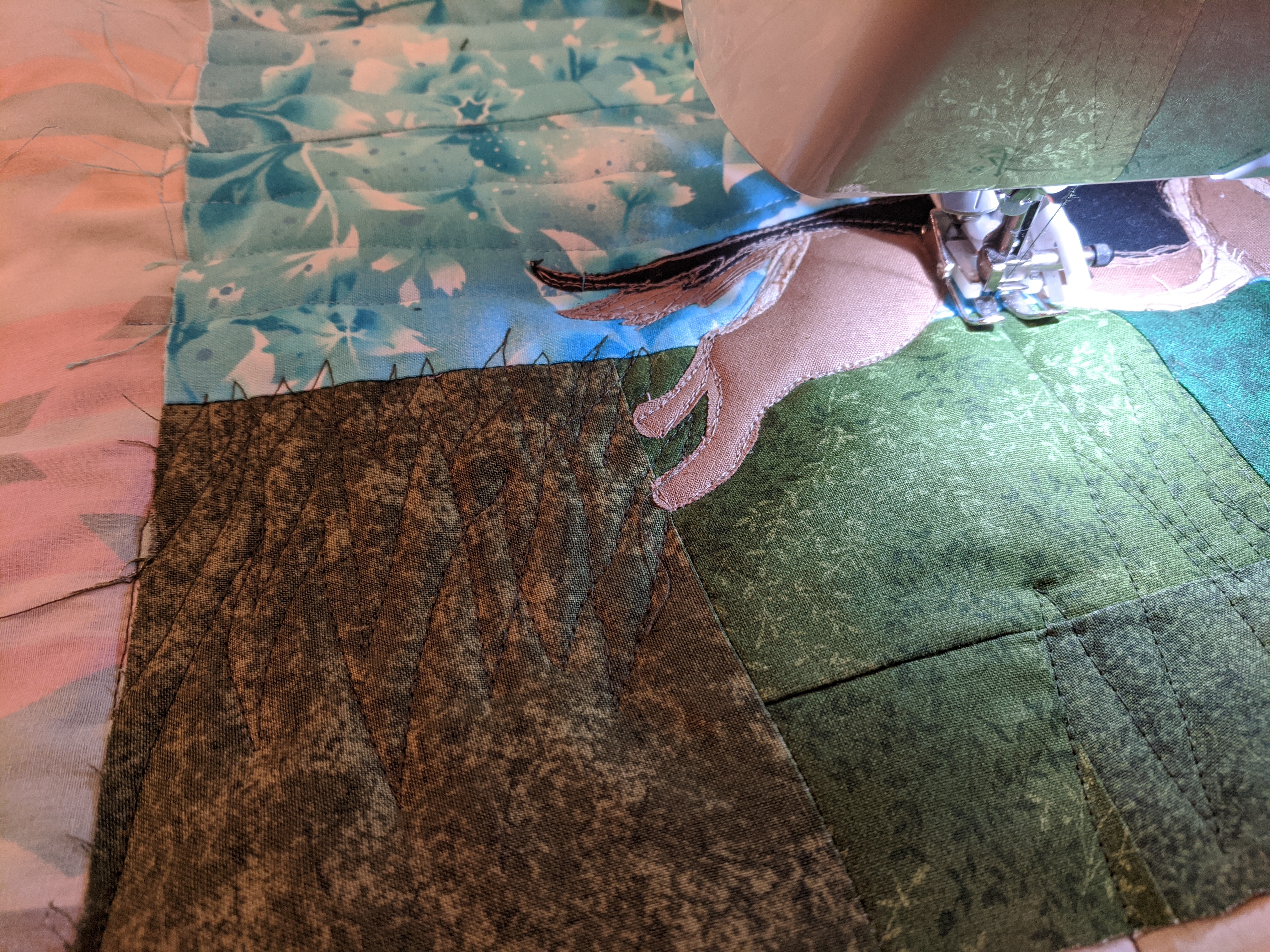 (above): Wall hanging of my mom’s dog for Mother’s Day, I used applique for the dog and FMQ to make grass texture which was really fun.