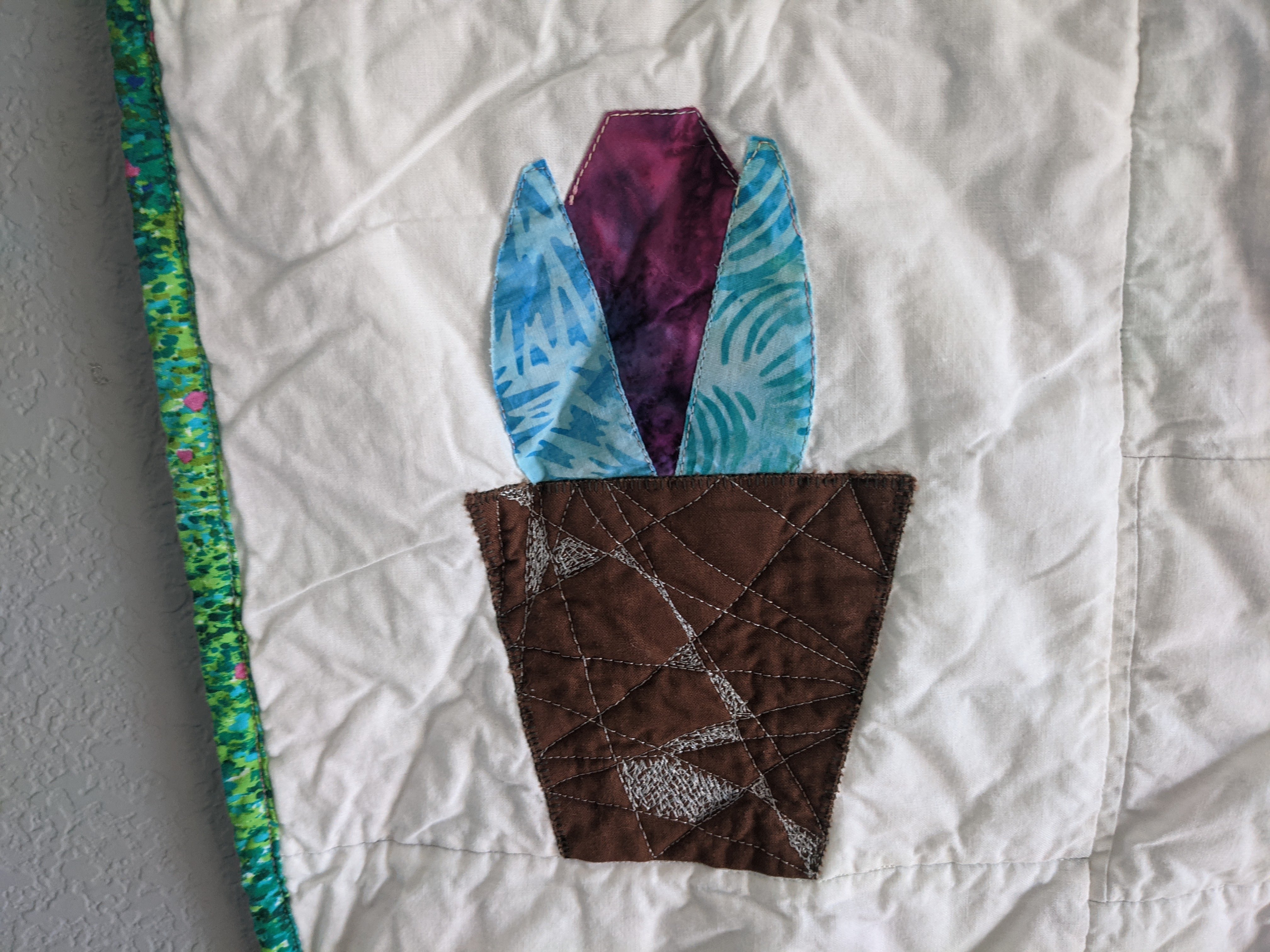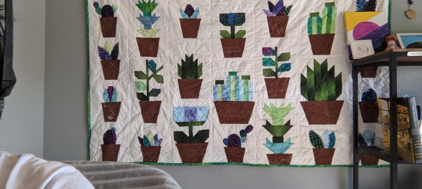 As I was finishing up, I wasn’t sure if it needed more quilting or if I should quit while I was ahead. The applique plants and pots had their own blanket stitch outlines, and the pots had the FMQ, but the Hartman blocks were kind of empty. I called a friend and we decided that I should do limited quilting on the Hartman plants so they blended in with the whole quilt. I matched the designs between the standard and enlarged blocks, so the small cactus has the same quilting as the large catcus, etc. I think it really brought everything together! Last up was the binding and putting it through the washer and dryer. Since I found them at Target, I throw in a “color catcher” sheet with all my new quilts (and some of my more brightly colored clothes), which did come out a gray-ish green.