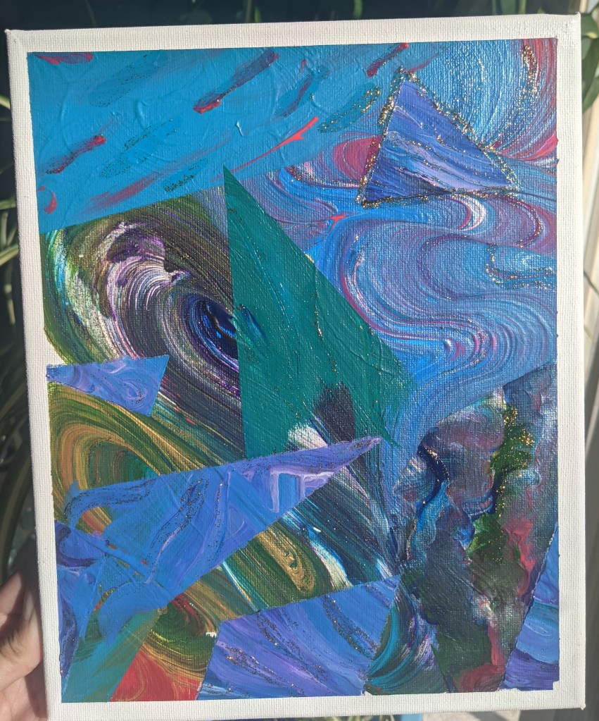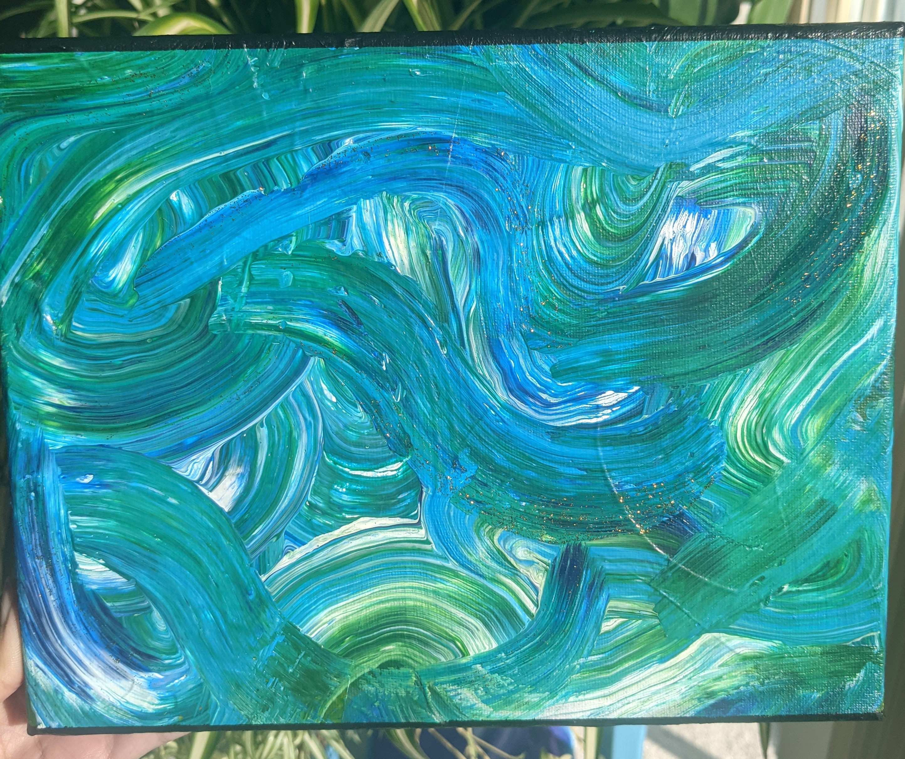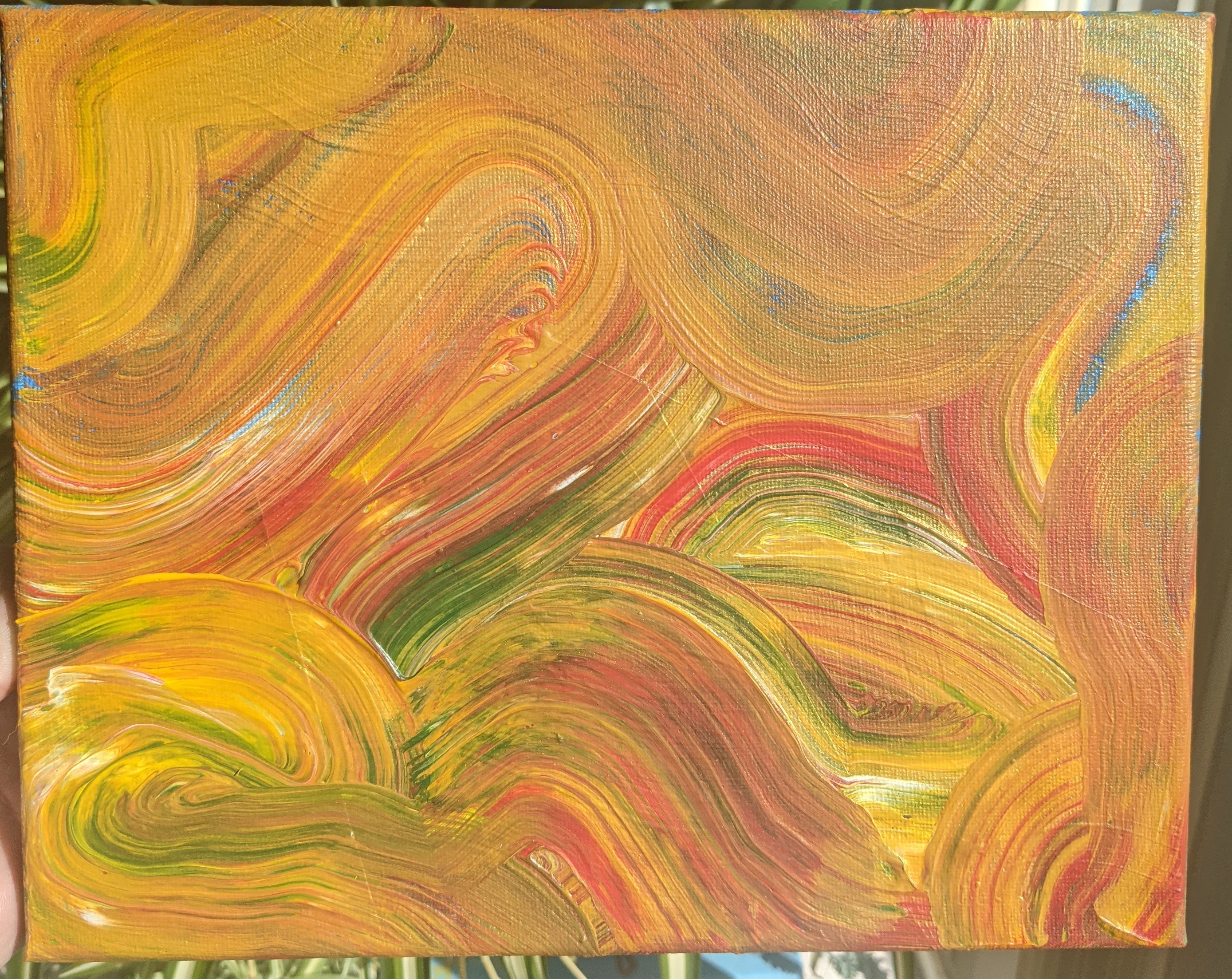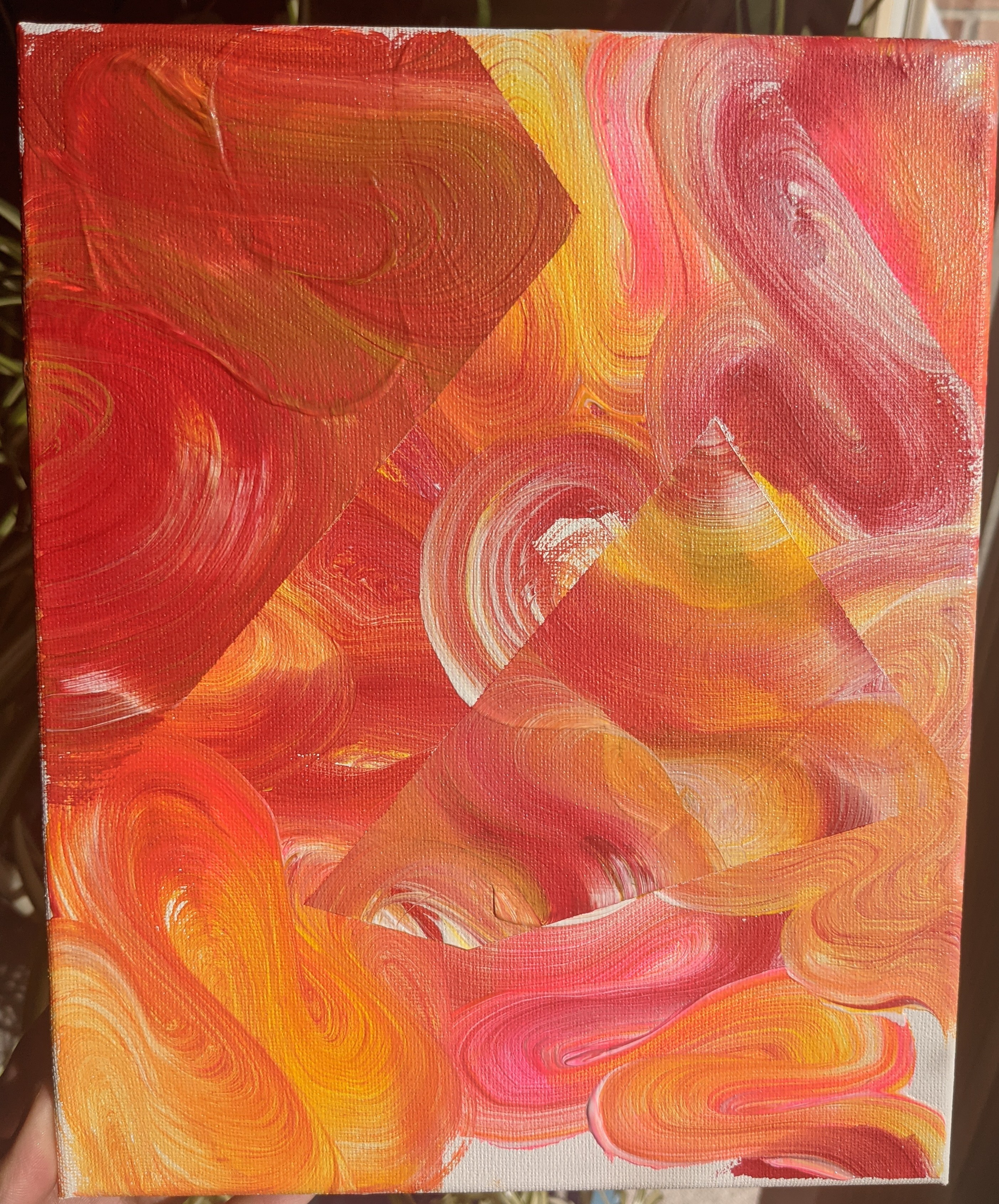 I was inspired to pick up the brush again by katiesstudio on TikTok; I wanted to try out their “swirl the blobs” technique of moving and mixing color across the canvas. And of course, I brought my masking tape techniques with me.
