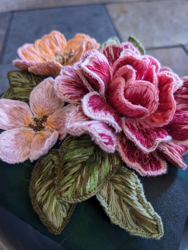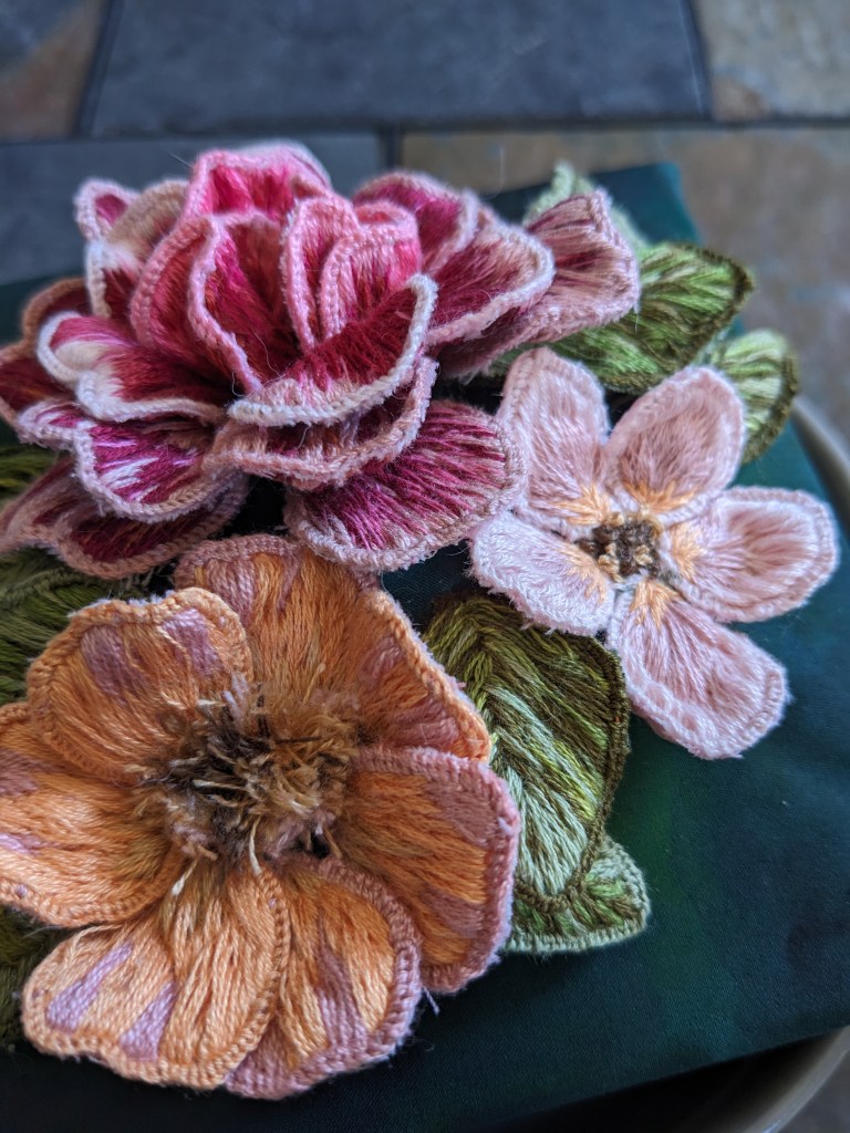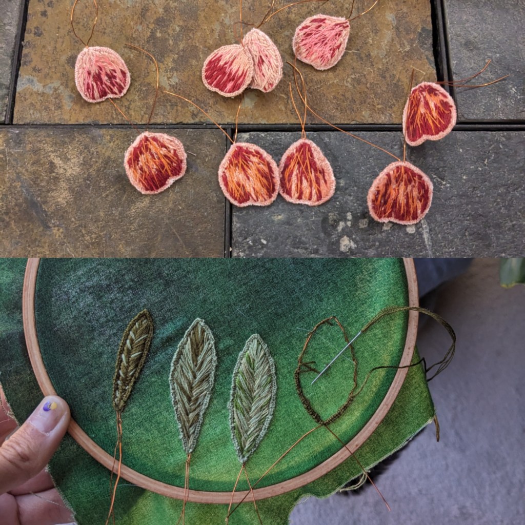 I poked the petals into one layer of fabric and folded the ends up, then embroidered the center stamens and pistils onto the fabric and anchored the petals to the fabric. Then I added in the leaves and made tiny stitches between petals and leaves and into the base fabric to secure all the elements together. I added another layer of fabric underneath the base fabric for some structural stability, and glued the entire assembly to a square canvas. The plain background ended up too plain, so I added some watercolor to the background to spruce it up and give it the idea of more leaves in the distance.