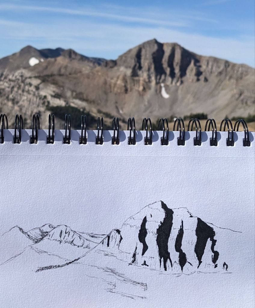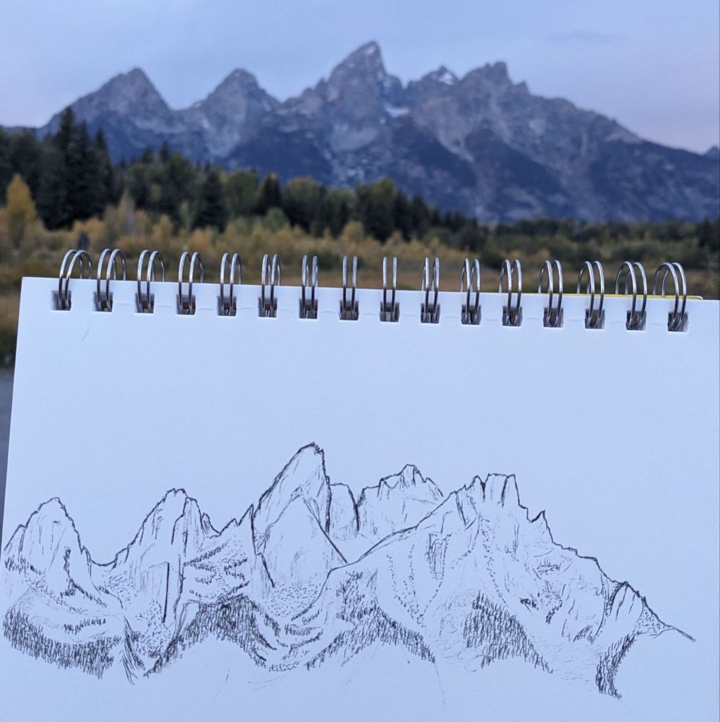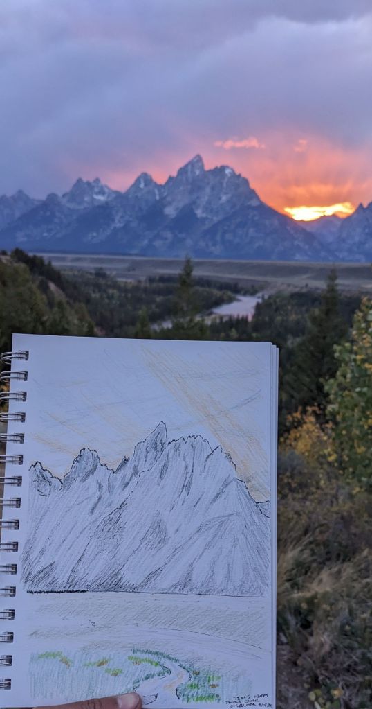 From Snake River Overlook, where Ansel Adams took his famous picture. The drama of this sunset lasted about thirty minutes and each moment was just as beautiful as the last. I liked the idea of using watercolor pencils and then maybe going back later with water, but I kind of like it just in pencil. This is also my first piece in my second sketchbook, since I finished the first one I bought in 2021! Not pictured: the lineup of photographers with fancy tripods that I was sitting next to.