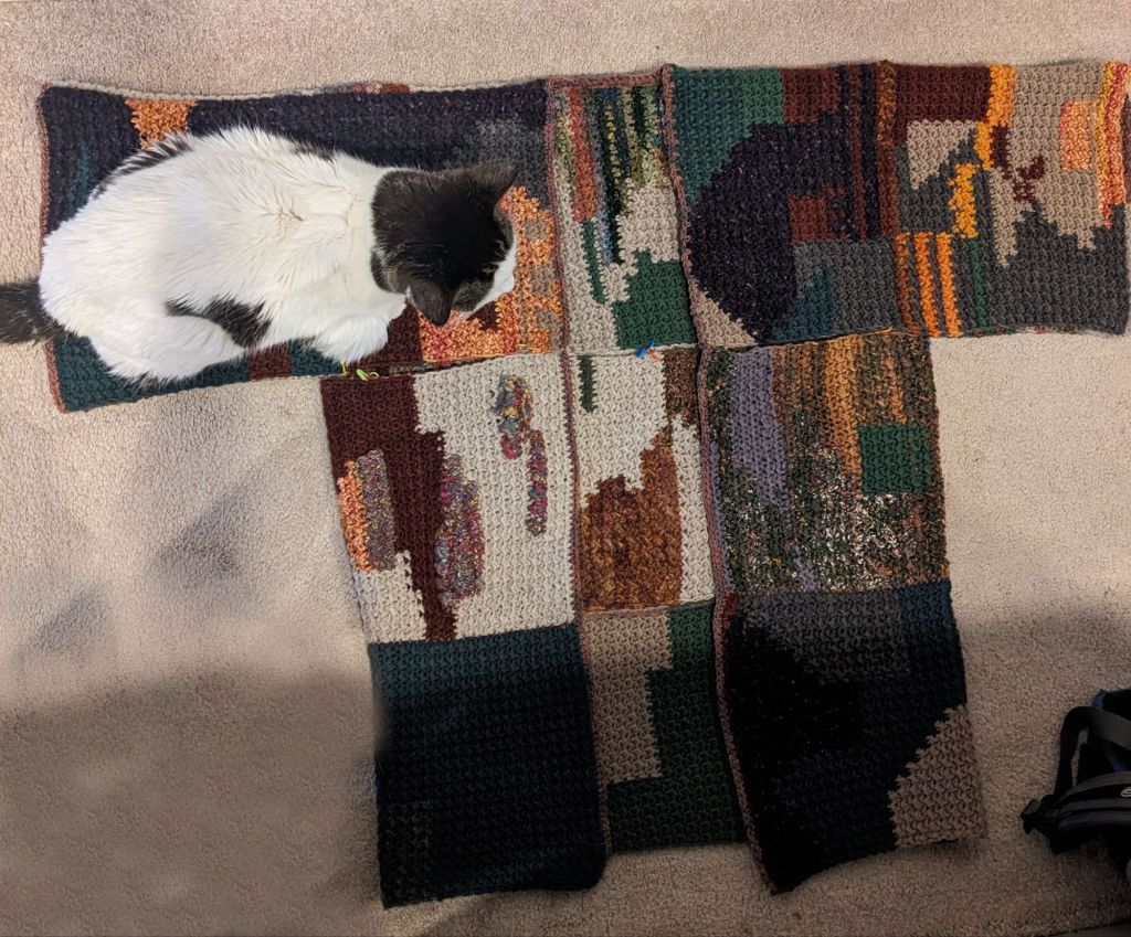 I started this project in the spring of 2023 as a way of using up scrap yarn and having a simple, easy hand-project for nights on the couch and zoom calls. I wanted to play with changing colors and having interesting color work while keeping the texture (crochet stitches) constant throughout. I did a simple (half double crochet, slip stitch) pattern and crocheted four panels of approximately the same size.