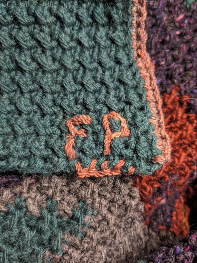 I’m very pleased with my final result, despite it not being my plan. It’s warm, but not hot because of the large, open sleeves. I even signed it, with 5 stitches for 2025.