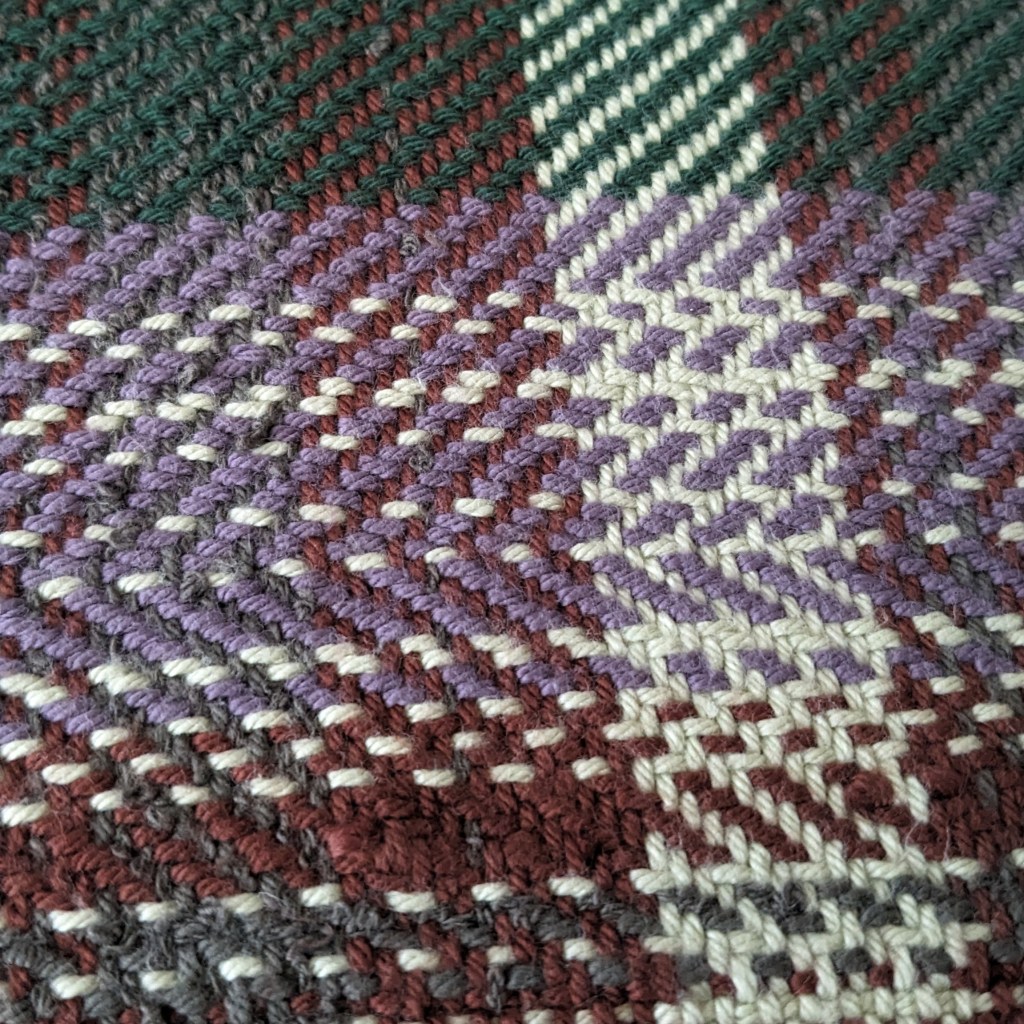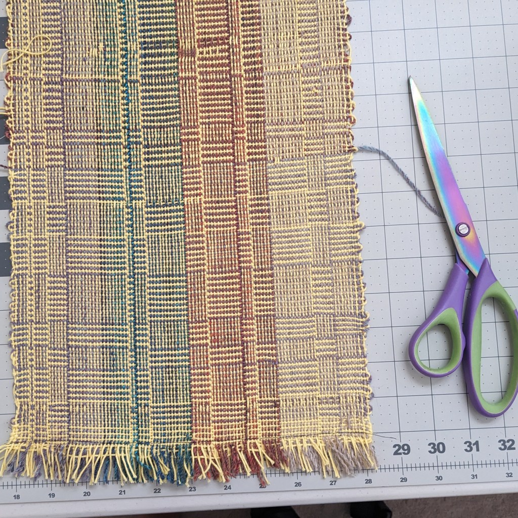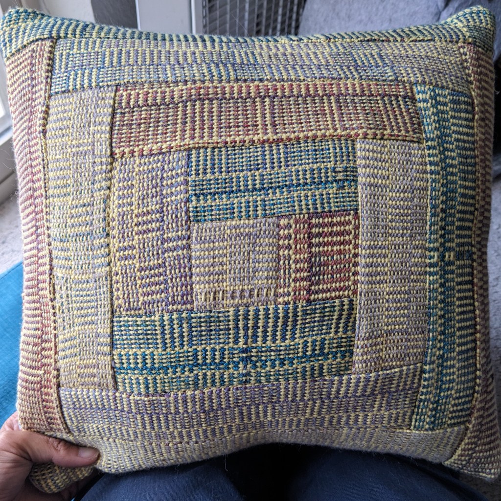 I wove my first “log cabin” pattern using handspun accent yarn and yellow commercial cotton, bravely cut it into strips, and quilted it using the “log cabin” block 🙂 so it’s my log cabin of log cabins pillow now.